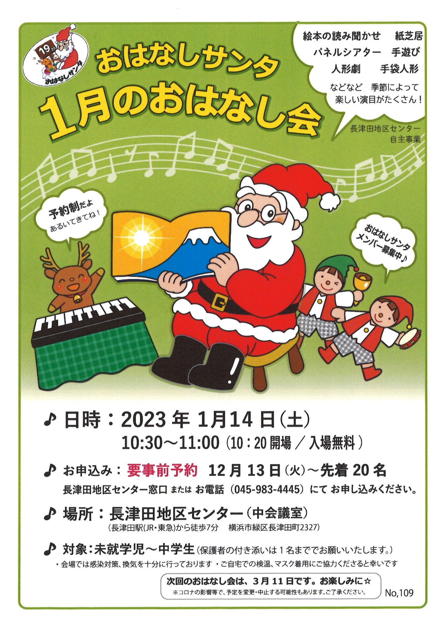- 持ち物:マスク・ハンドタオル・筆記具・お持ち帰りの袋