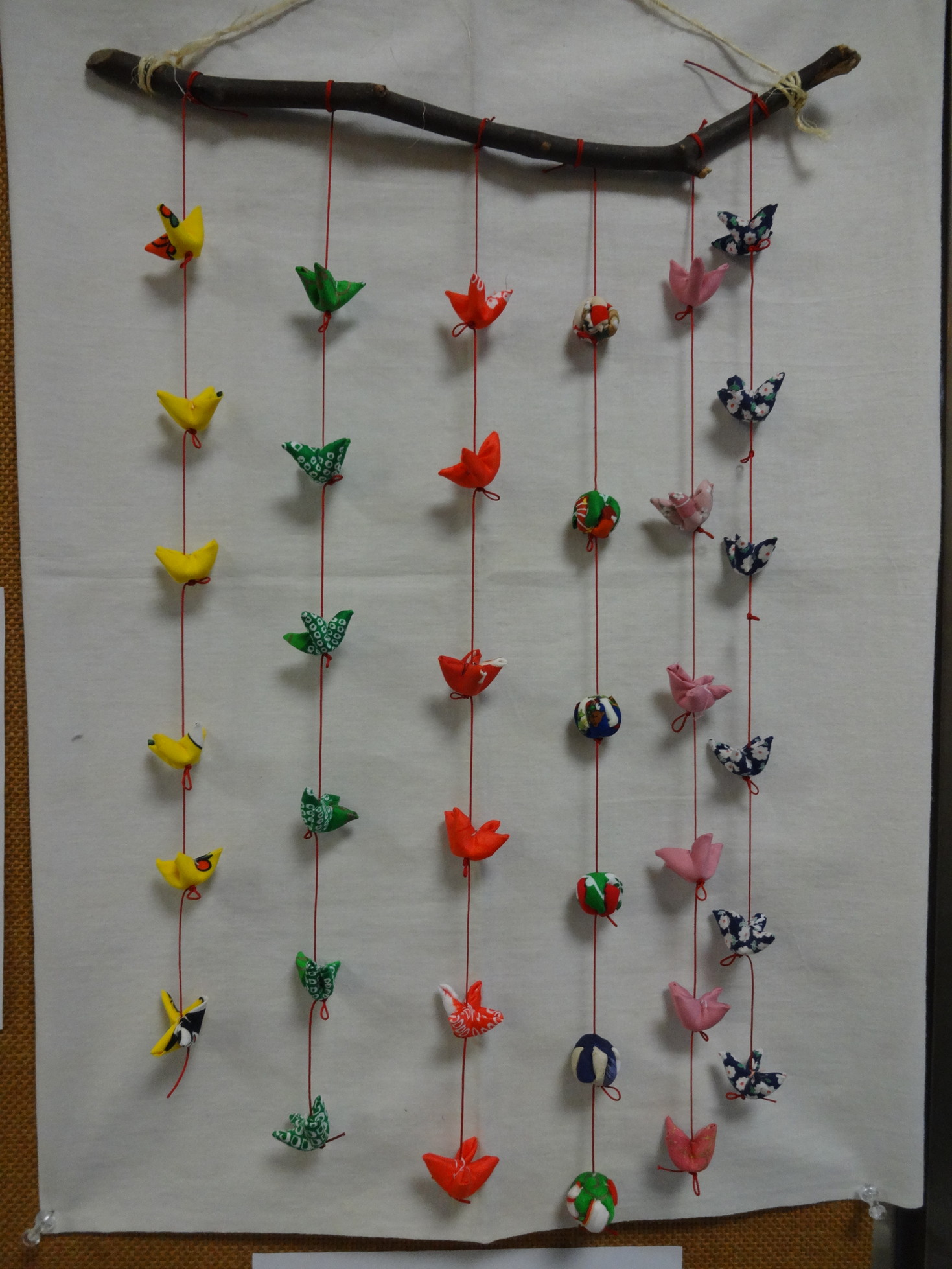 約3センチくらいのさるぼぼを42個作り、枝に6個づつ吊るします。