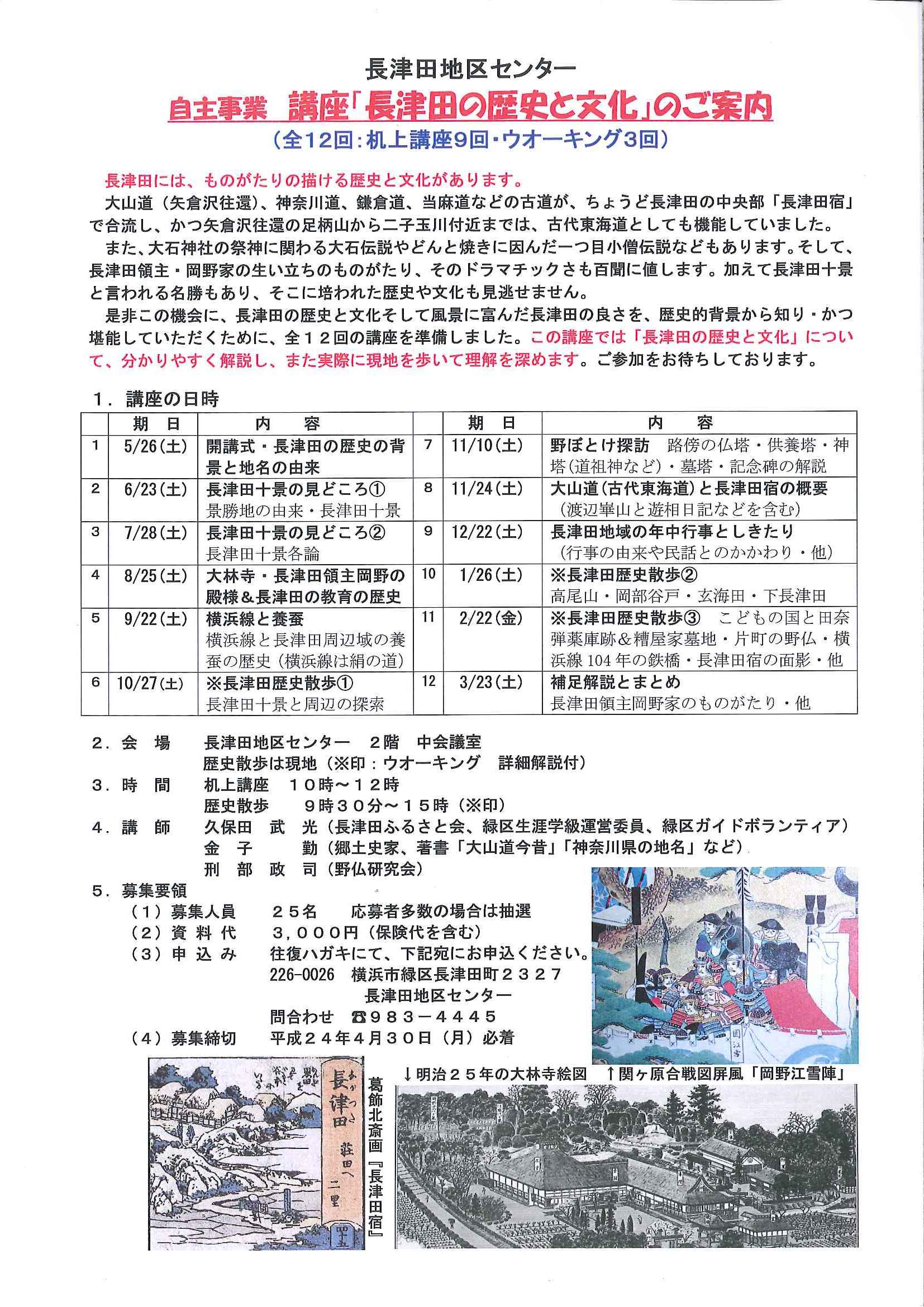 講座では、「長津田の歴史と文化」について、分かりやすく解説し、また実際に現地を歩いて理解を深めます。