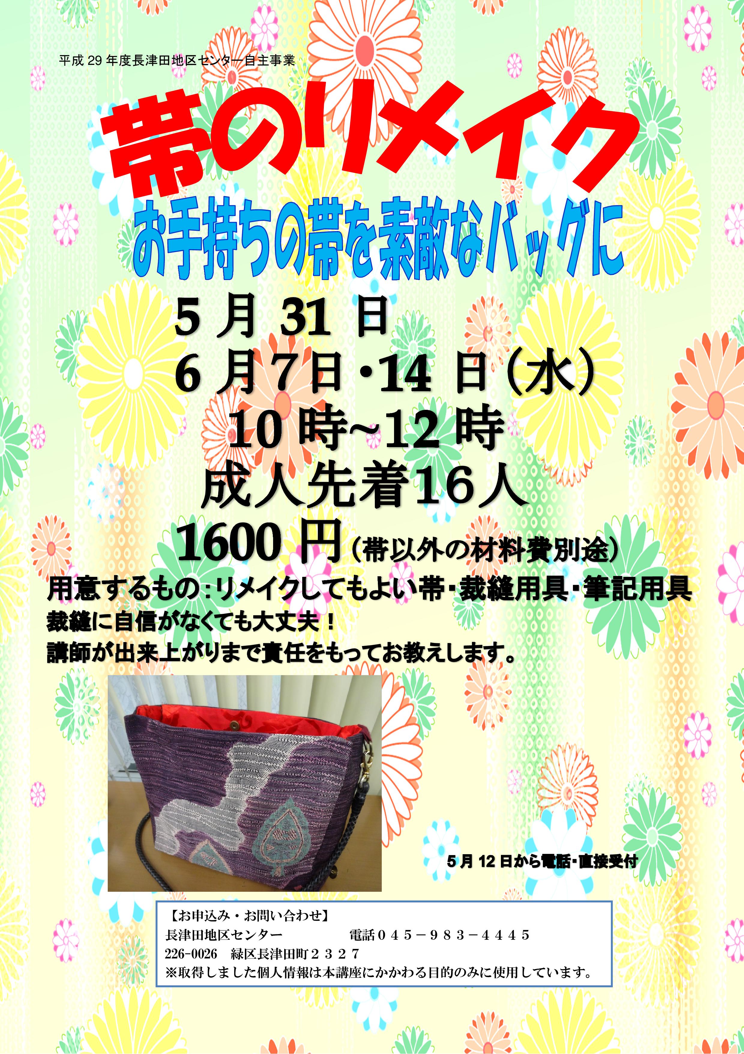前回の「帯のリメイク」でキャンセル待ちで参加できなかった方ももう一度作ってみたい方もこの機会にぜひどうぞ。