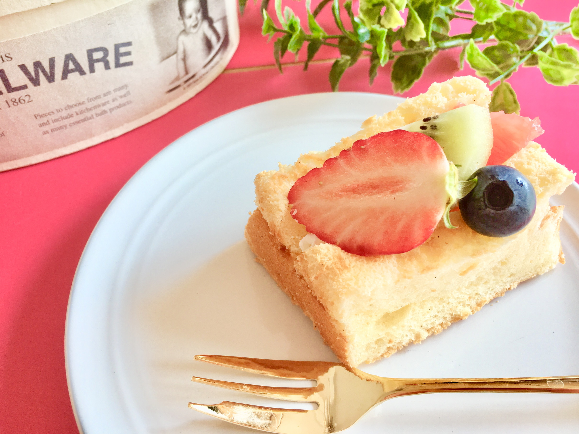 シフォンケーキを作ってカットし、生クリームやフルーツを飾ります。