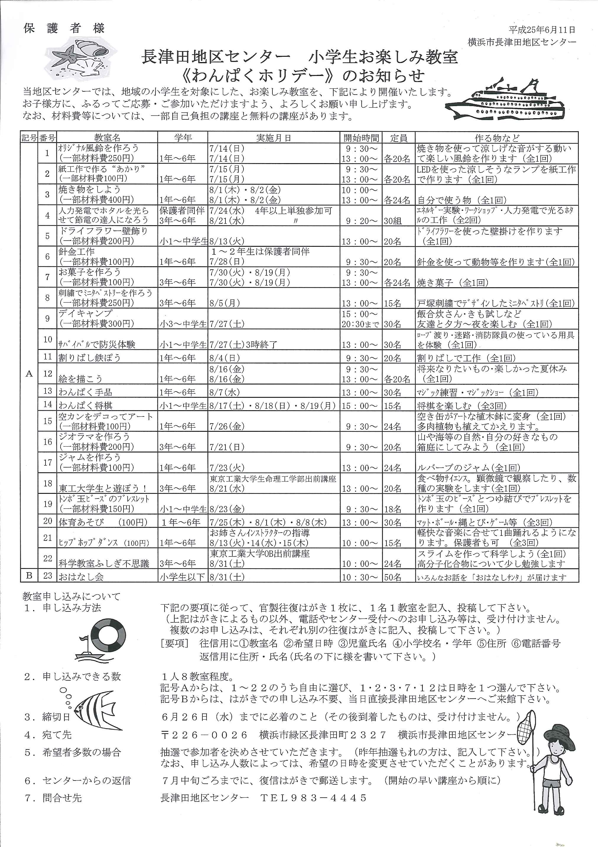 - ①教室名②希望日時③児童氏名④学校名・学年⑤住所⑥電話番号を明記して長津田地区センターまで。