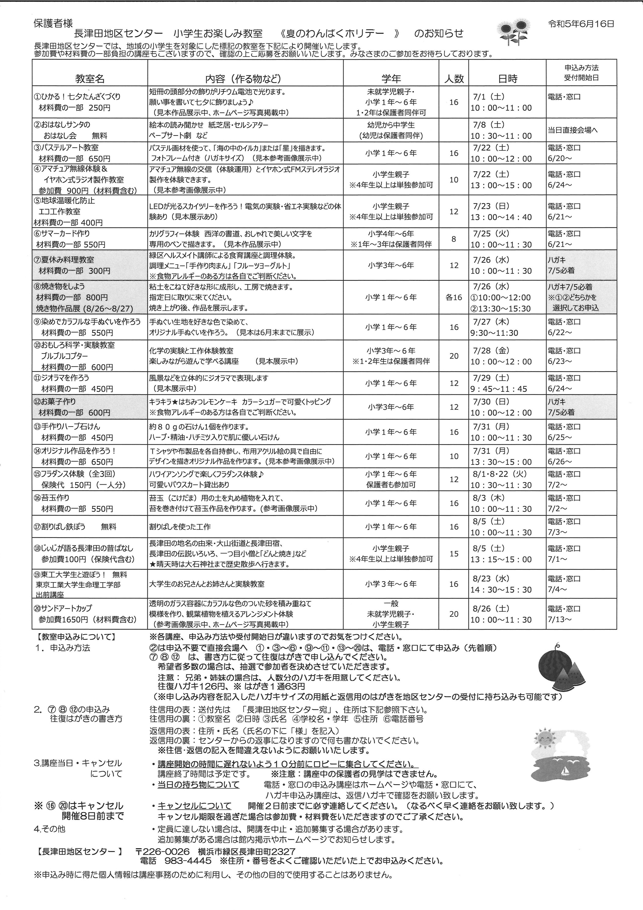 持ち物:ハンドタオル・水筒・持ち帰りの袋・一部材料費450円