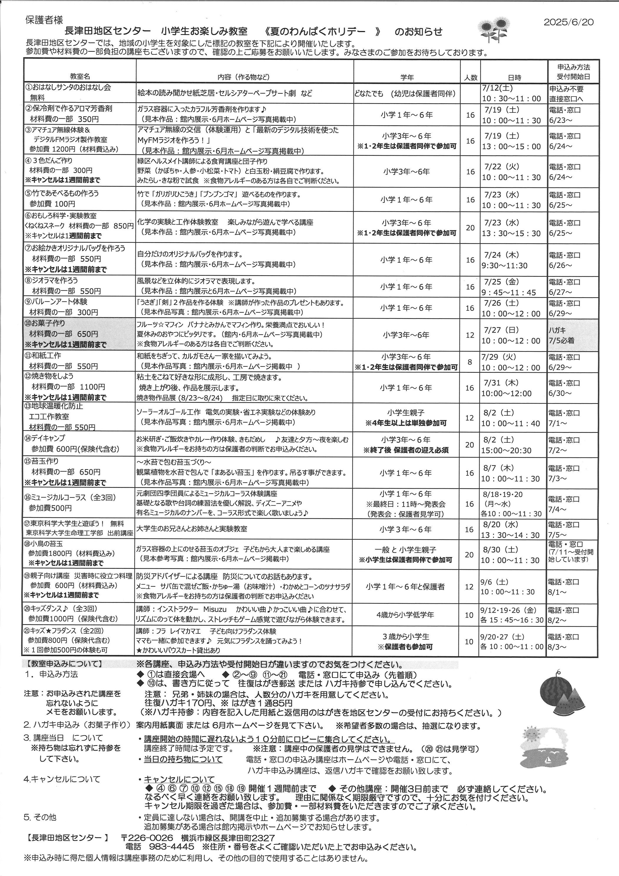 小学生 夏わんぱくホリデー 8月開催講座 持ち物