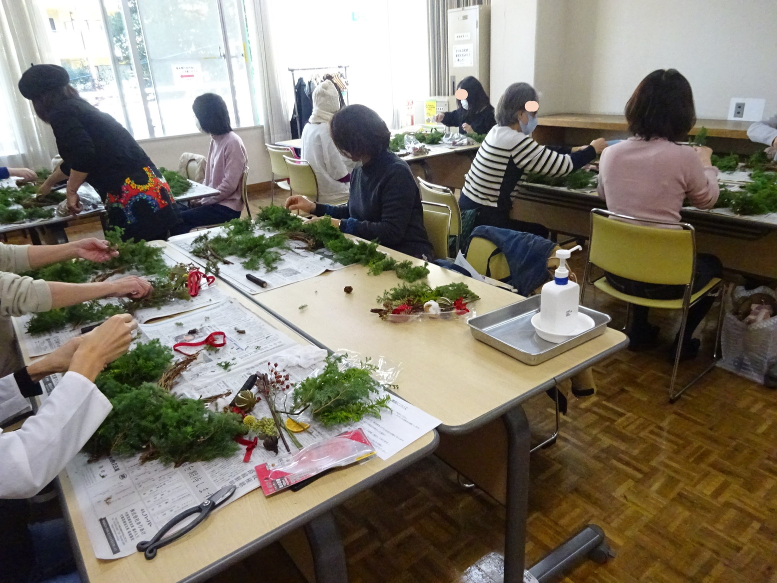 お花屋さんによるアレンジメント講座で 三日月型の土台にワイヤーを使ってヒムロ杉を巻き パーツを付けて仕上げる講座を開催しました。 ヒムロ杉をワイヤーに巻き付けるのが難しく大変そうでしたが、 講師に習いながら、素敵な作品が出来上がっていました。 参加者のみなさま、豪華でおしゃれなクリスマス飾り たいへん喜ばれていました。