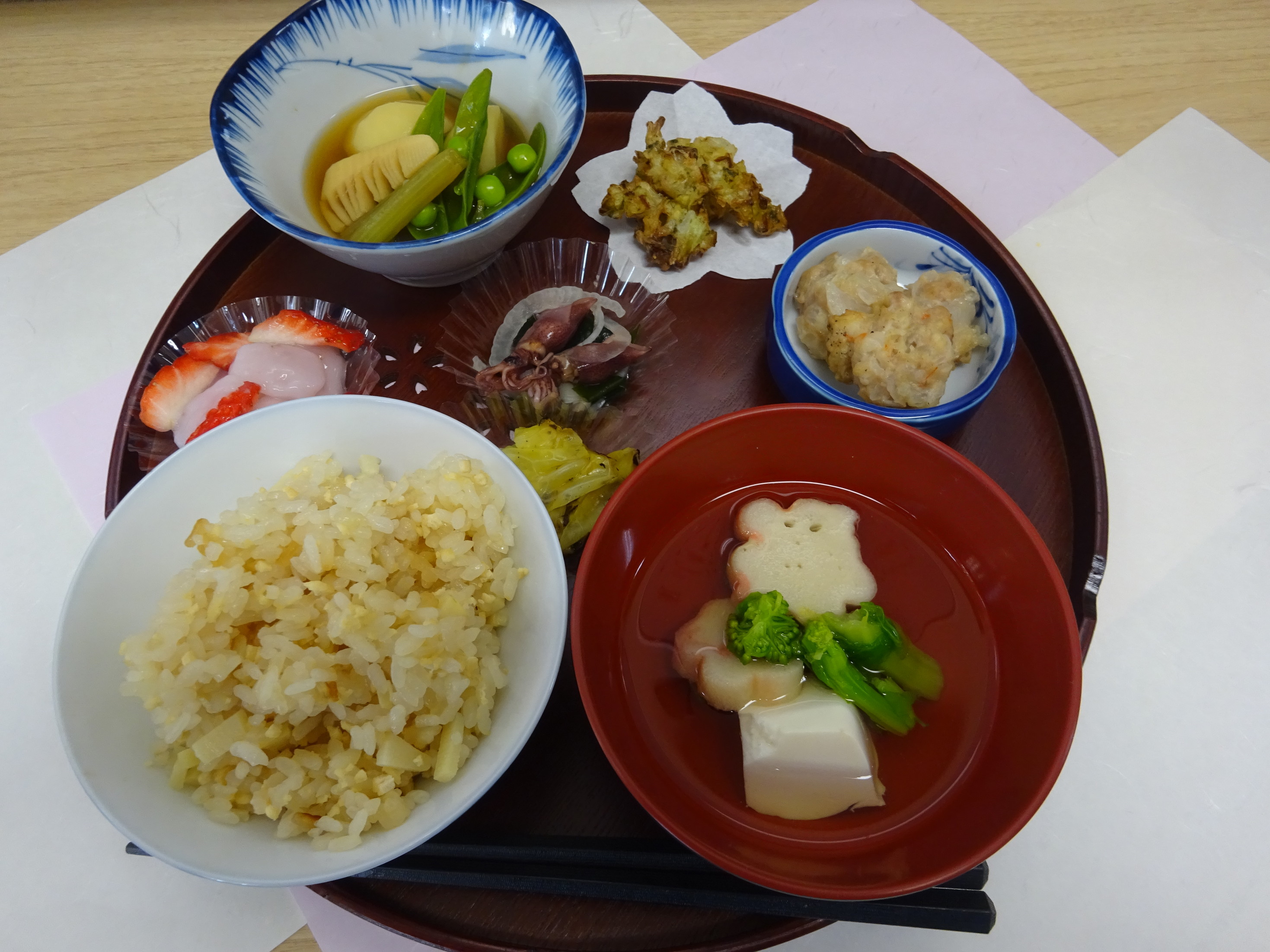 申込みが多く、大変人気の講座 春らしい彩りもきれいなミニ懐石膳を作りました。 食材の下ごしらえ・調理のコツなど習うことが出来て 見た目も美味しいミニ懐石御膳が出来上がり、 参加者のみなさまに大変喜ばれていました。 メニュー ★春野菜の小鉢 ★新玉ねぎの海老しゅうまい ★たけのこご飯 ★菜花のお吸い物 ★苺ミルク白玉