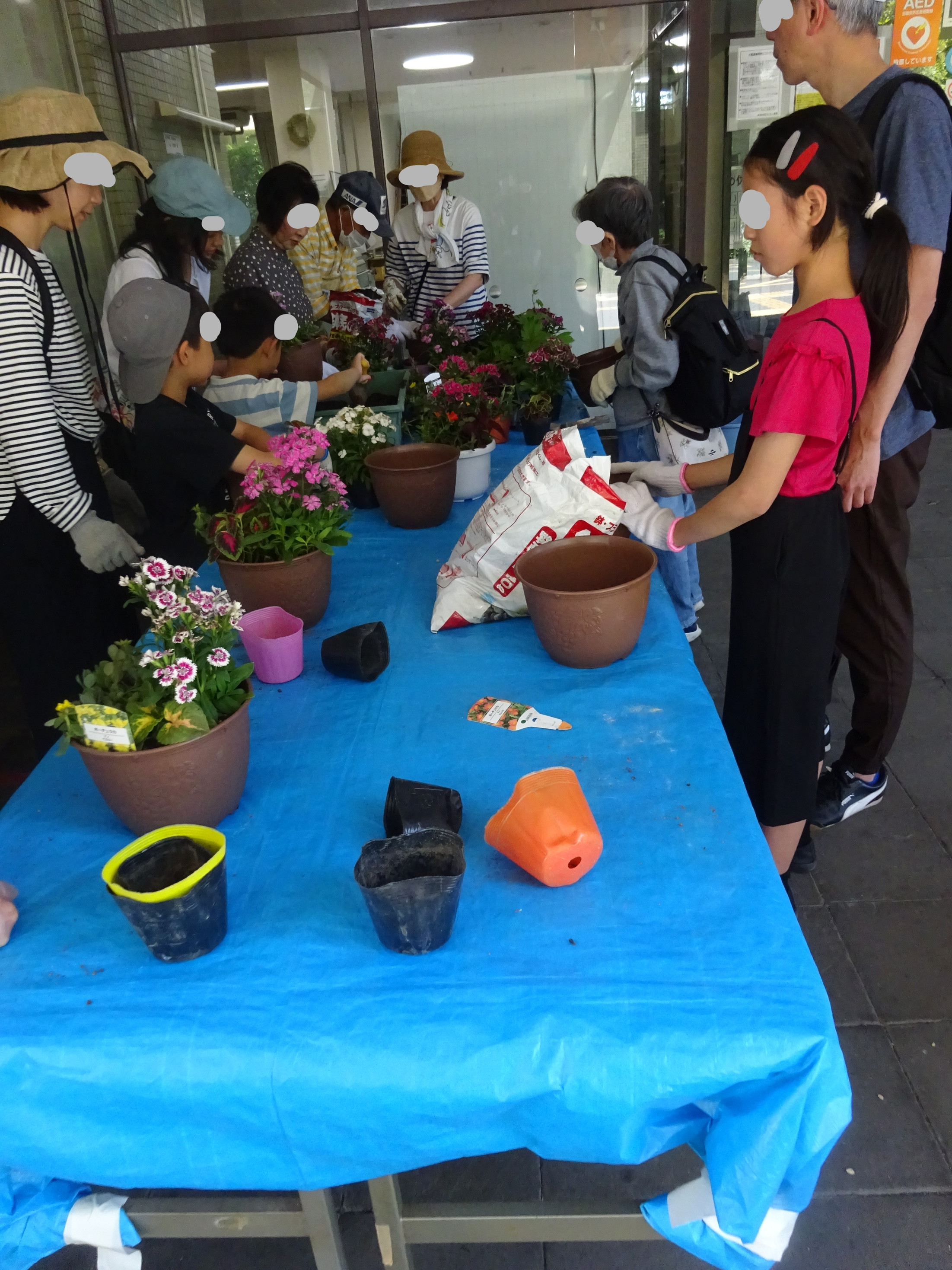 ゴーヤ植えと寄せ植え体験講座 子どもから大人まで、つたのは学園の方も一緒に 楽しく体験して頂きました。 ゴーヤはプランター植えをし、 ネット張りをしてある地区センター プレイルーム窓近く、 プランターを置きました。 寄せ植えは3種類の植物を、初心者でも分かりやすい ように講師がアドバイスしながら植えました。 お持ち帰りができるので、参加者のみなさまに 喜ばれていました。