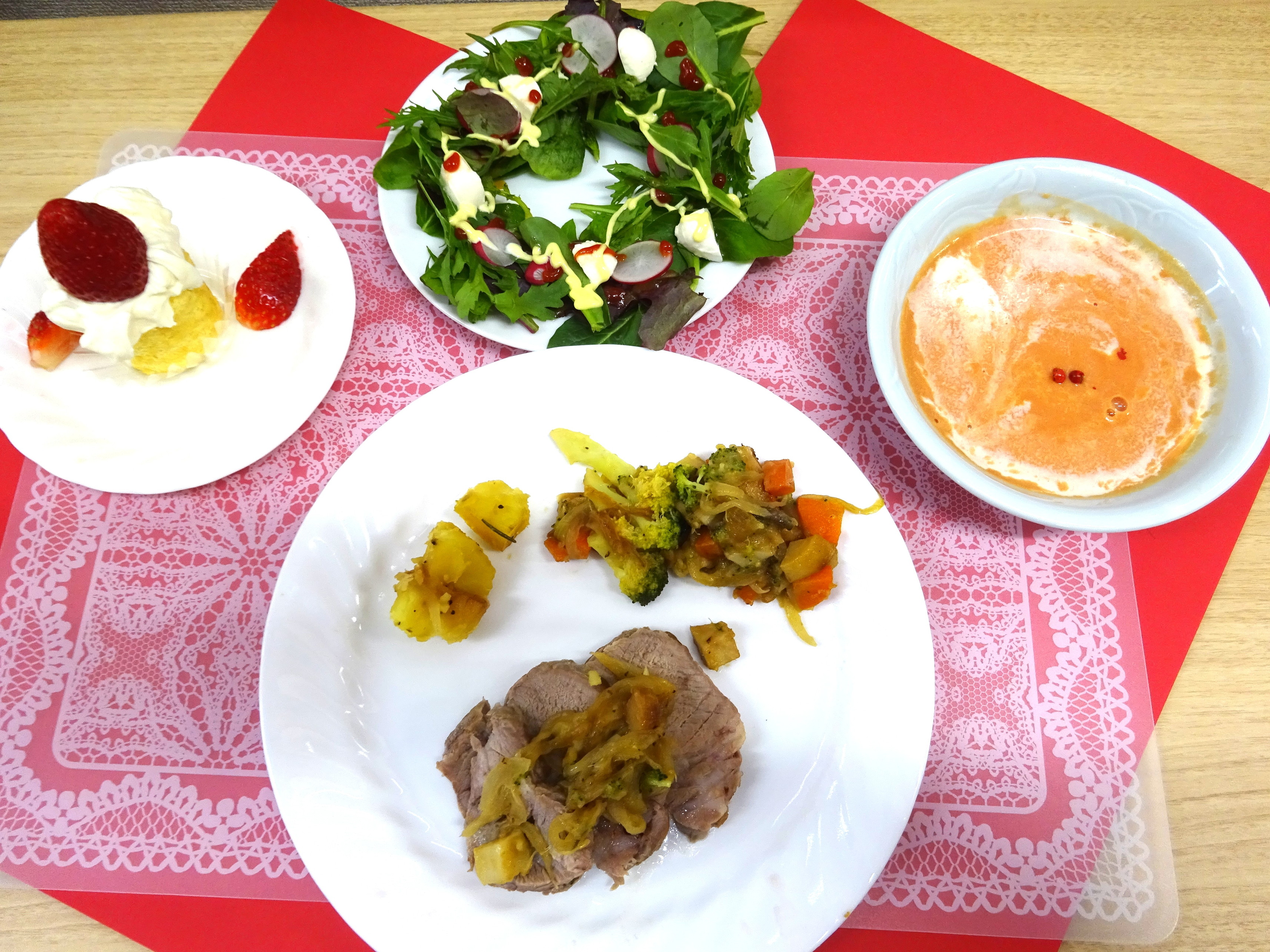 申込み多く人気の講座 野菜ソムリエ講師によるクリスマス料理講座を 開催しました。 メインからデザートまで どれも美味しかったです。 ローストポークをフライパンでうまく作ることができました。 クリスマスに作ってみますなどの感想をいただきました。 メニュー ★赤のポタージュ ★リースサラダ ★ローストポーク ★キャンドルロールケーキ