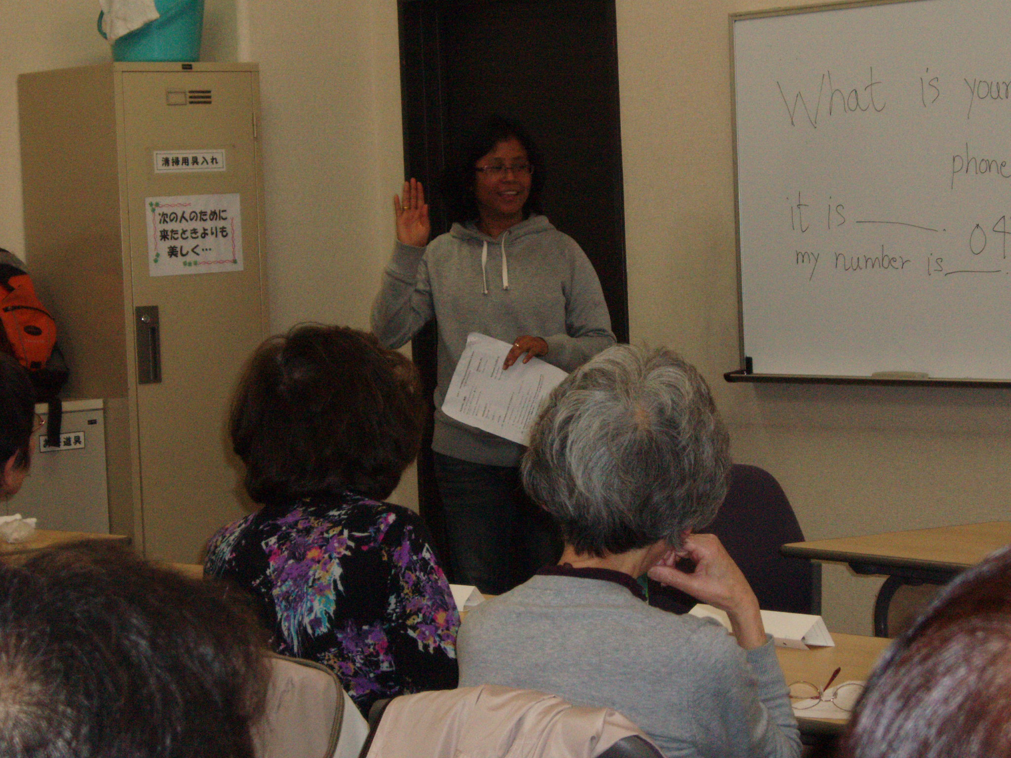 4月19日 15人の定員のところ講師のご厚意で20人でのスタートを今日からきりました。 皆さん活発に答えておられてました。恥ずかしがっては、ダメですよ!! 初歩の英会話ですが、さすが日本の教育は、すばらしいと思いました・・・・・ 後9回の講座ですが皆様ずーっと前からのお知り合いの様に和気あいあいと受講されていました。 講師のティリ先生のリーダシップが良いのでしょうか 最終回を迎える日がとても楽しみな教室です。