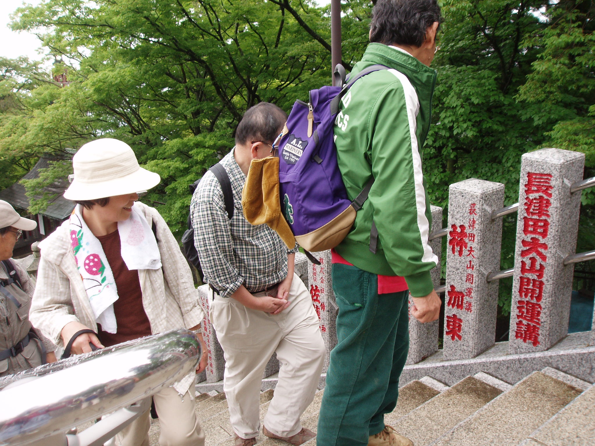 大山街道ウォーキングの最終地大山です。下社では、長津田大山講の石碑を確認しておおはしゃぎ、その後は、全員 無言で真剣に歩を進めていました。一番困ったのは、山ヒルです。何人も被害にあいました。大山に行く時は、塩を 持って行くように!!