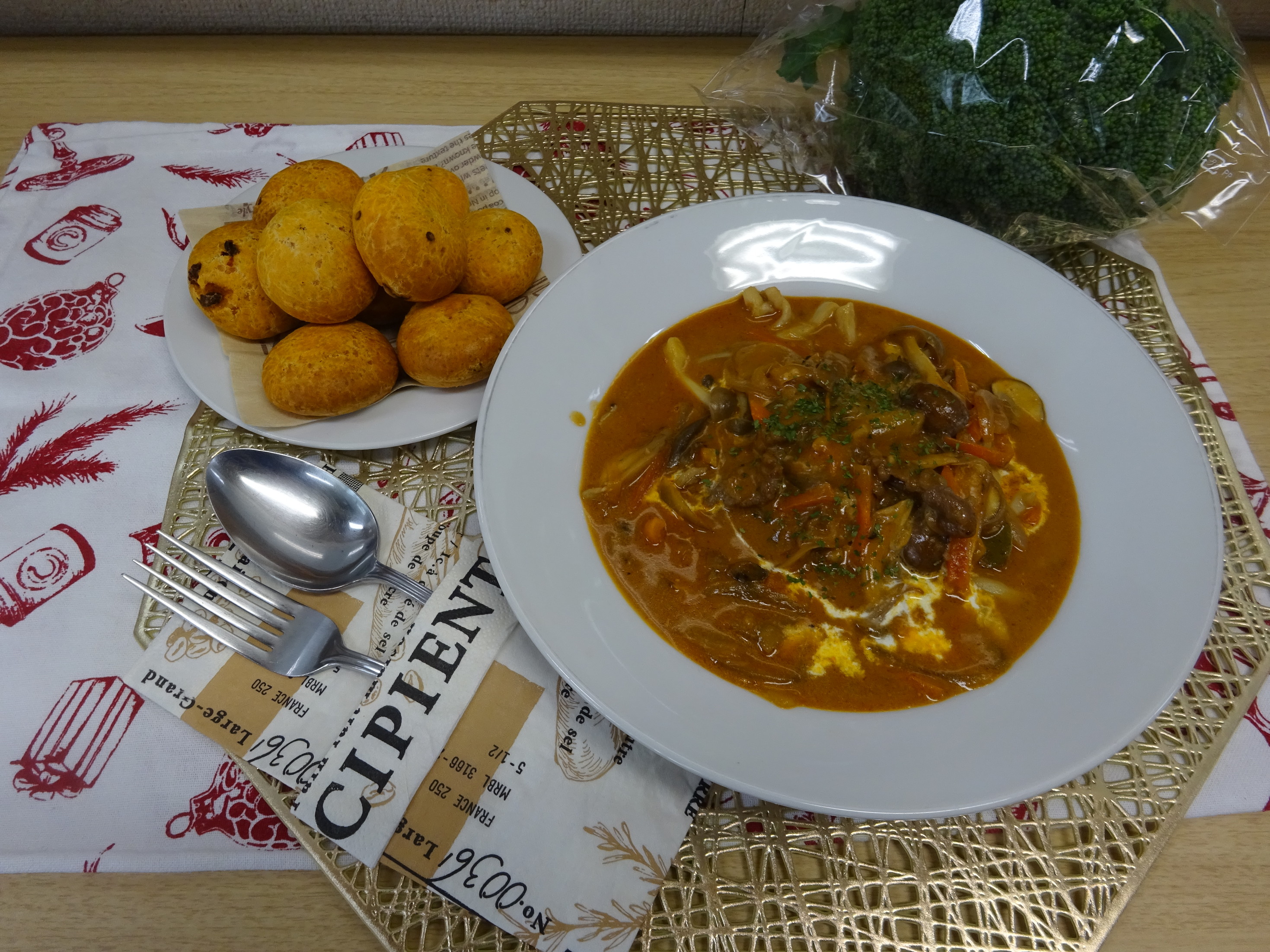 申込多く人気の講座でした。 パプリカ・玉ねぎ・人参やきのこなど 沢山の野菜を使ったビーフストロガノフ と 米粉を使ってトマトのポン・デ・ケージョを 作りました。 クリスマスのランチにぴったりな料理が出来上がり 参加者の皆様に喜ばれていました。
