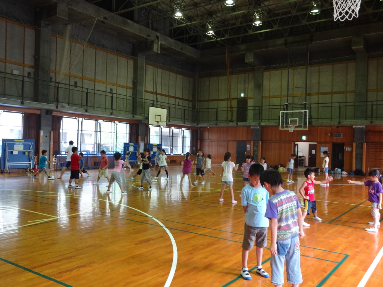 じゃんけん遊び、ボール遊び、新聞紙を使った遊び・・・様々な遊びを取り入れて 汗びっしょりなのに子ども達は楽しそう。 暑さも吹っ飛ぶほど元気です! 最後にシャワーミストにあたり少しひんやり・・・ 次回もお楽しみに。
