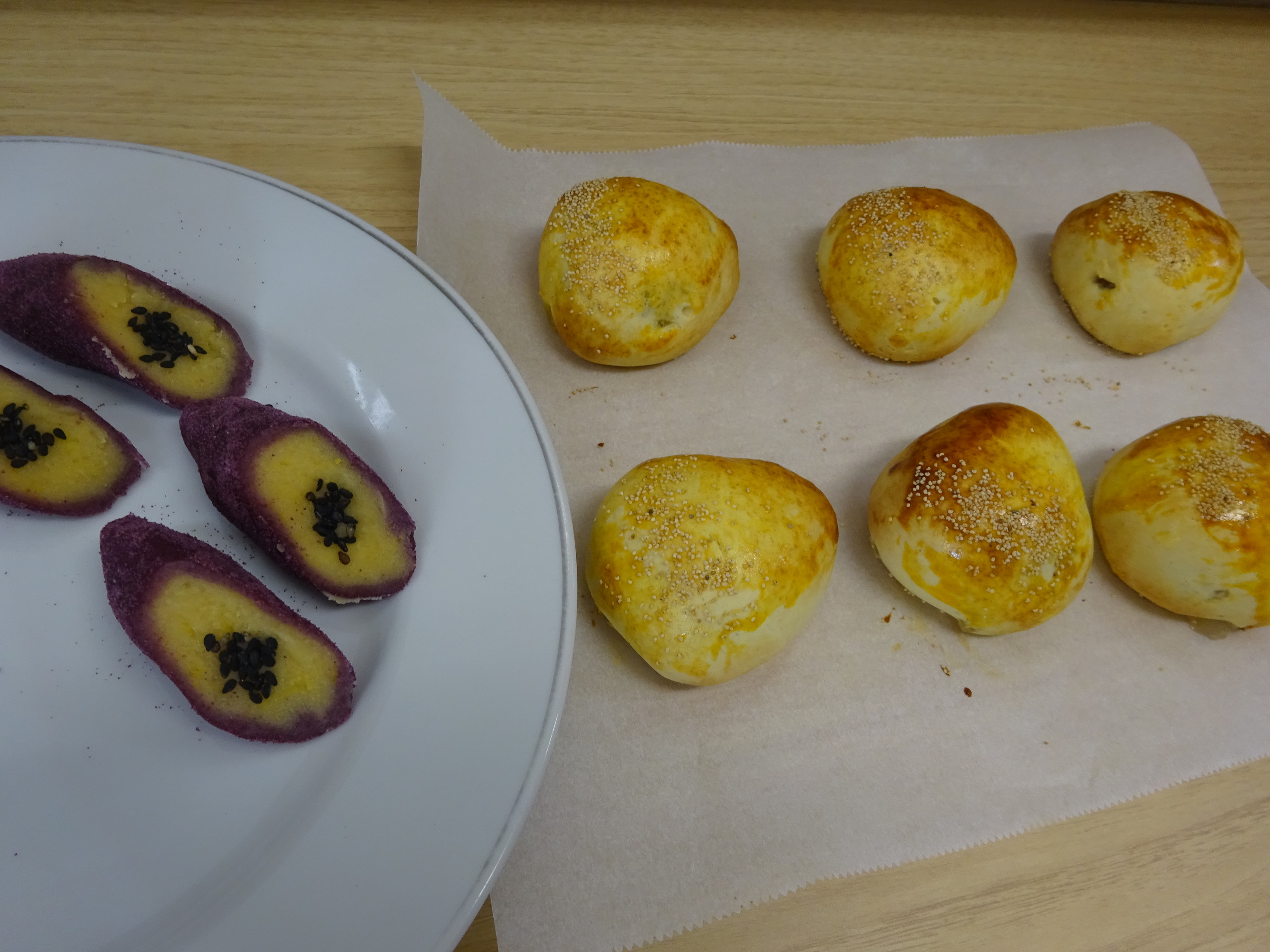 秋を感じられる和菓子講座を開催しました。 栗饅頭 白あんで栗を包んだ餡を生地で包み込み、 栗の形にして焼き上げ サツマイモきんとん 紫パウダーを混ぜた餡で 白あんで作った餡を包み サツマイモの形に 見て楽しめる美味しい和菓子が出来上がり 参加者の皆様に喜ばれていました。