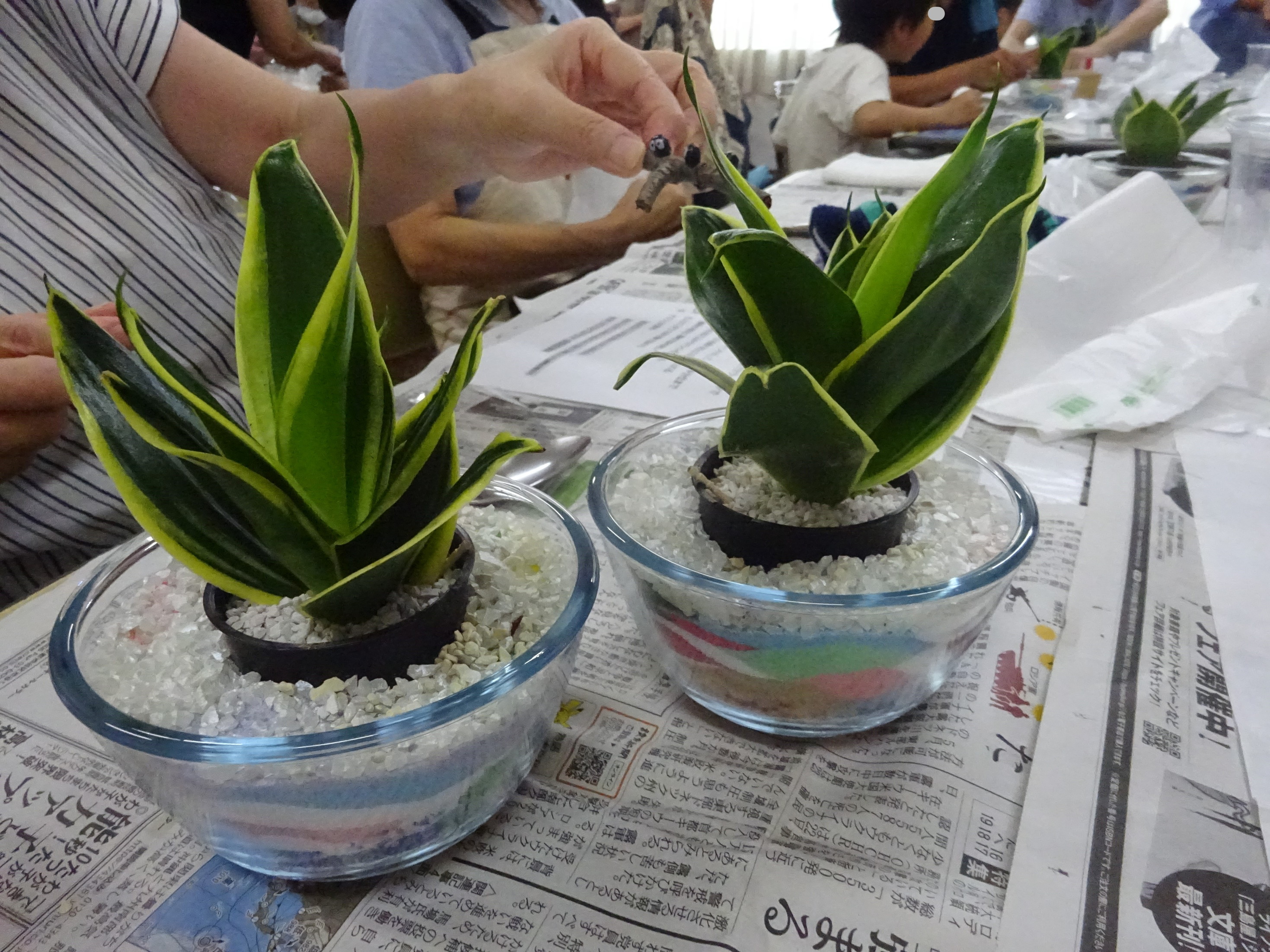 小学生親子や成人の方々、大勢の方に参加して頂きました。 ガラスの容器にカラフルな色のついた砂(カラーサンド)を積み重ねて模様を作り 観葉植物を真ん中に植えて出来上がり、 子どもから大人まで楽しめる講座で 参加者のみなさまに喜ばれていました。