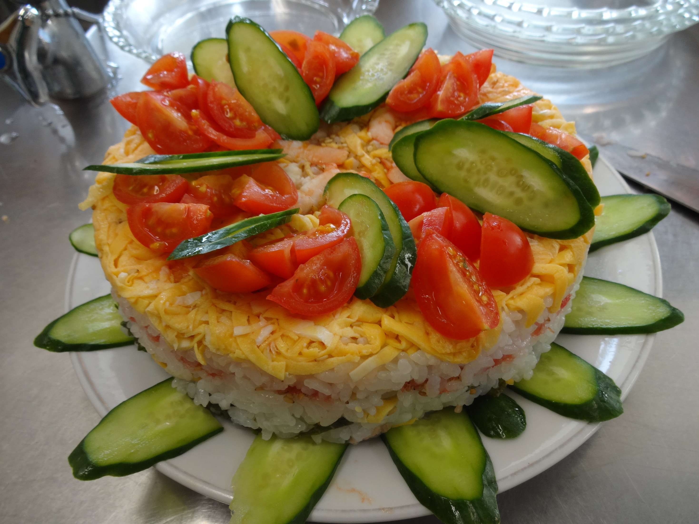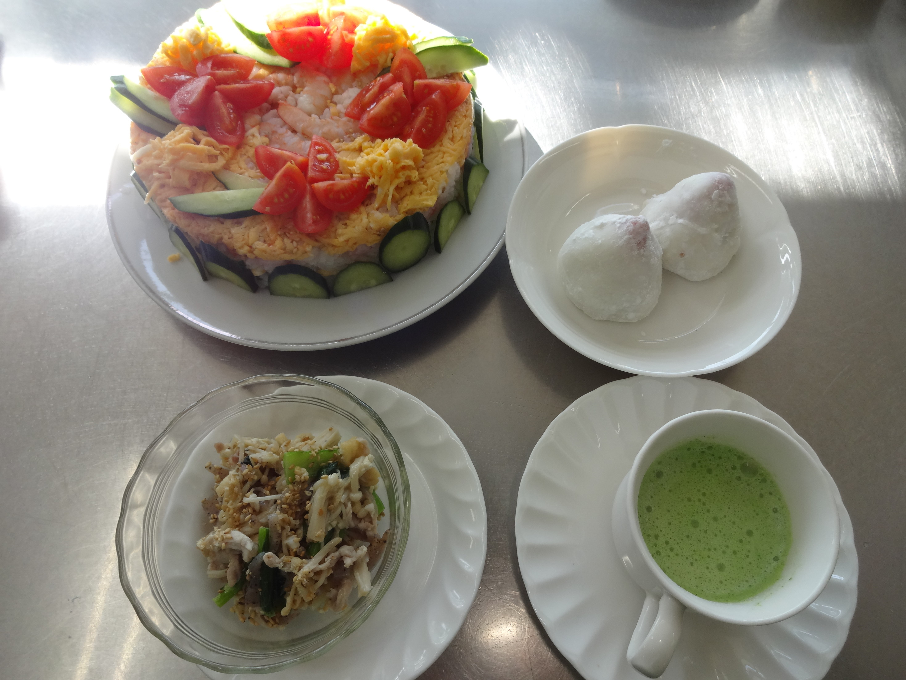 丸い型で、デコレーションケーキのようなちらしずし、小松菜のスープ、小松菜のナムル、そしていちご大福を作りました。 写真のようなおいしそうなひなまつり料理が完成しました。 3月のおひなさまにみなさんもう一度作ってみるそうです。 ぜひ、ご家族の感想を聞かせてください!