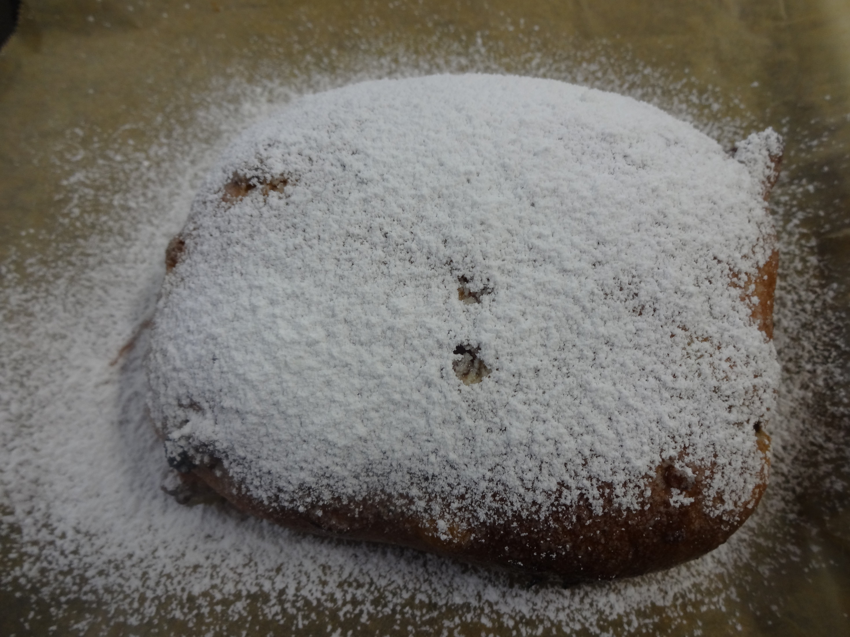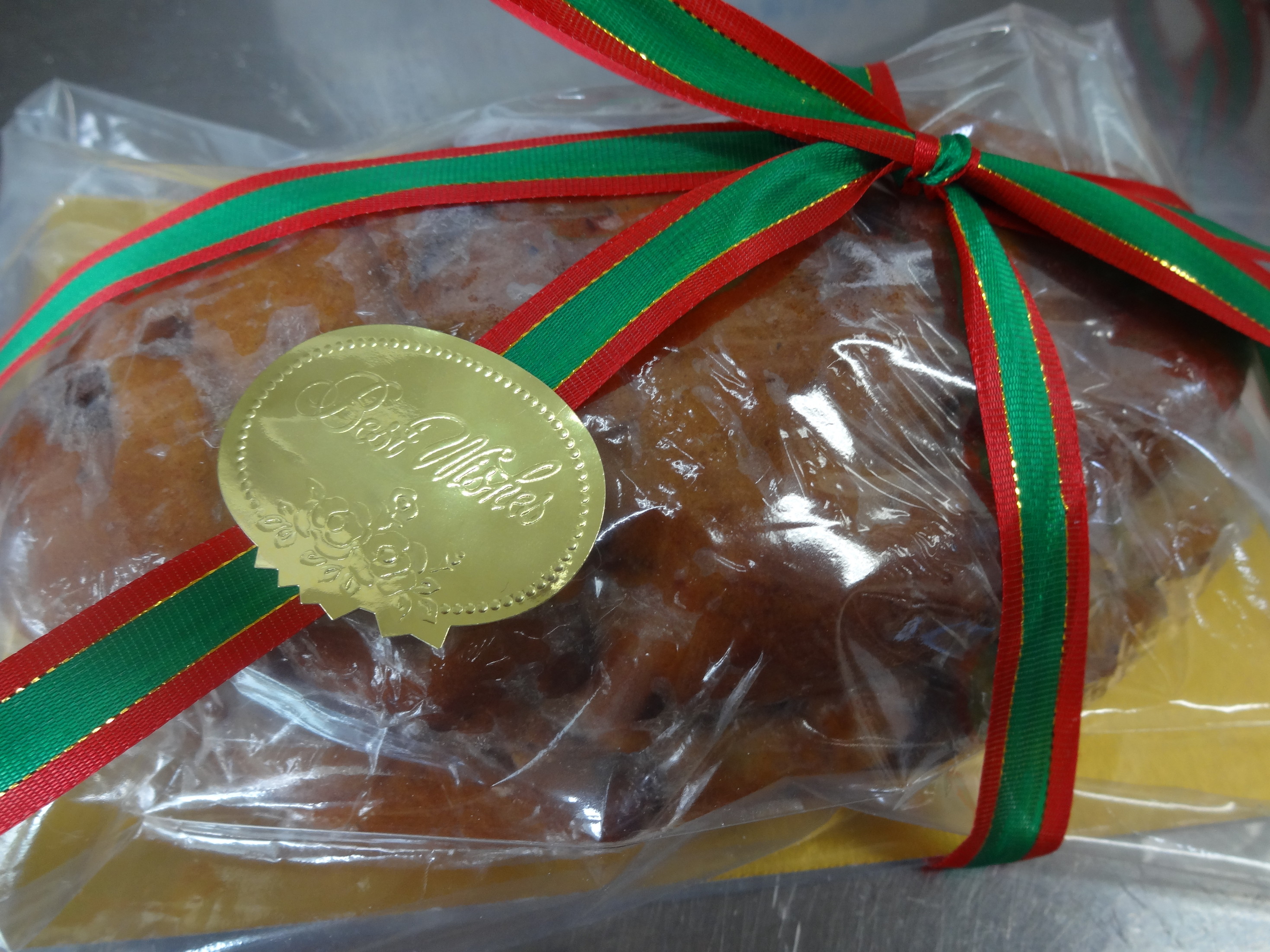 スパイスの香りとバターの香りで料理室は良い香りに包まれ、シュトーレン作りをしました。 最後に粉糖をかけて出来上がり。(良い粉糖は白く残らないそうですよ) 少し冷まして、ラッピングしました。 ゆっくり食べるなんてできないわ。 家に帰って早速食べます。と参加者の声
