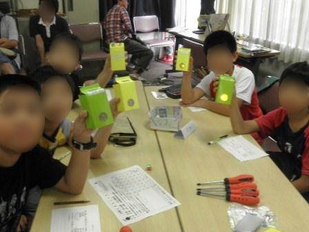 どの子どもたちも節電対策の宿題がでていましたが、25%節電できたようです。スバラシイですネ!ワークショップや実験などをした後は、おひさまランタン作りです。音楽も出て明かりもともる贅沢なランタンが出来上がりました。「組み立てるのが難しかった」と、感想がありました。難しいほどやりがいがあったのでしょう。