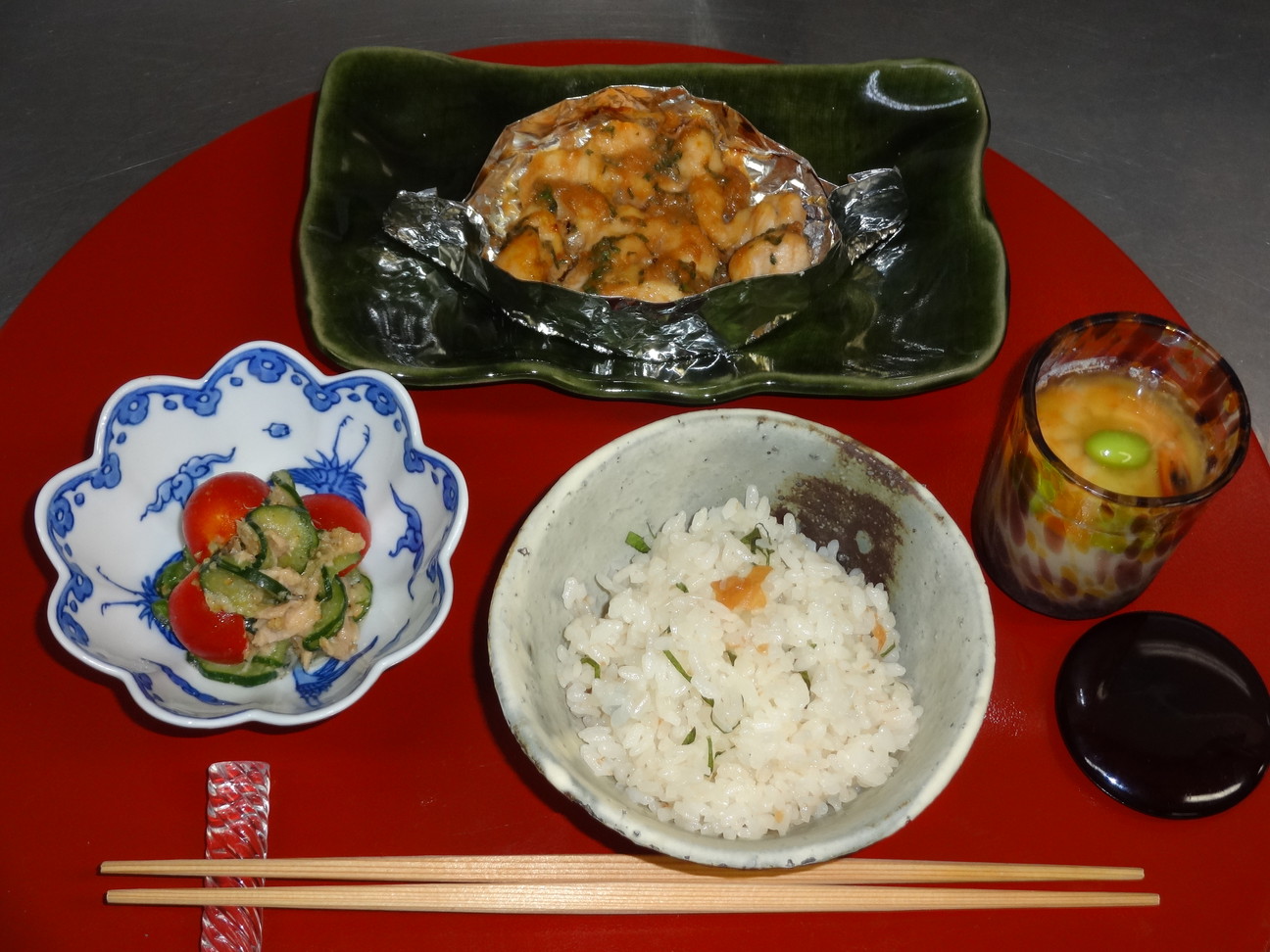「鶏の香り焼き」「豆乳の冷やし茶碗蒸し」「きゅうりのプチトマトツナの胡麻酢」「梅シソご飯」
