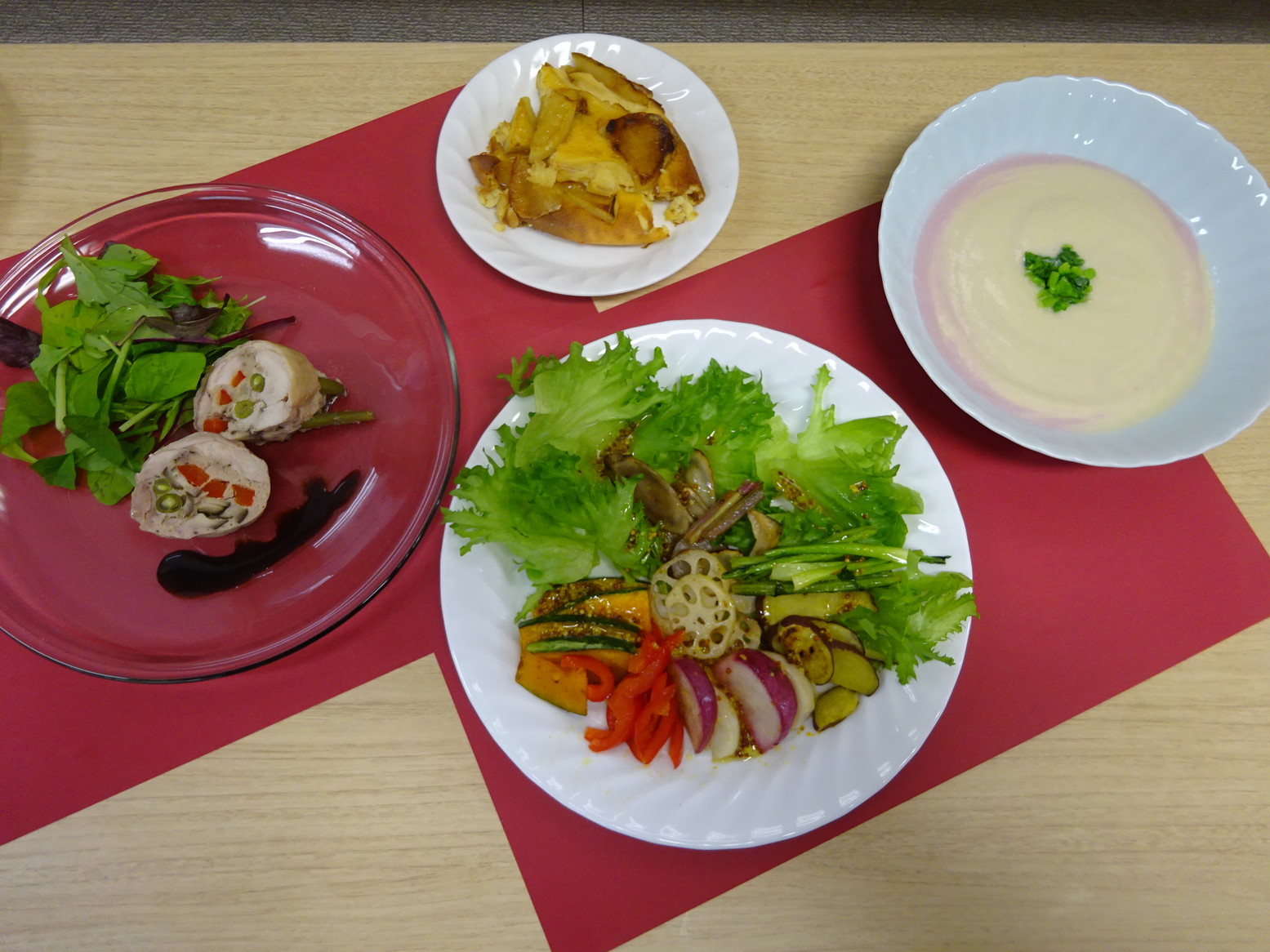 野菜ソムリエ講師による おもてなし料理講座を開催しました。 メニューは ★かぶの2色のポタージュ ★野菜と鶏のガランティーヌ ★焼き野菜のサラダ ★りんごのクラフティ 美味しく出来上がり とても参考になりました。 また参加してみたいとの感想が 多くありました。