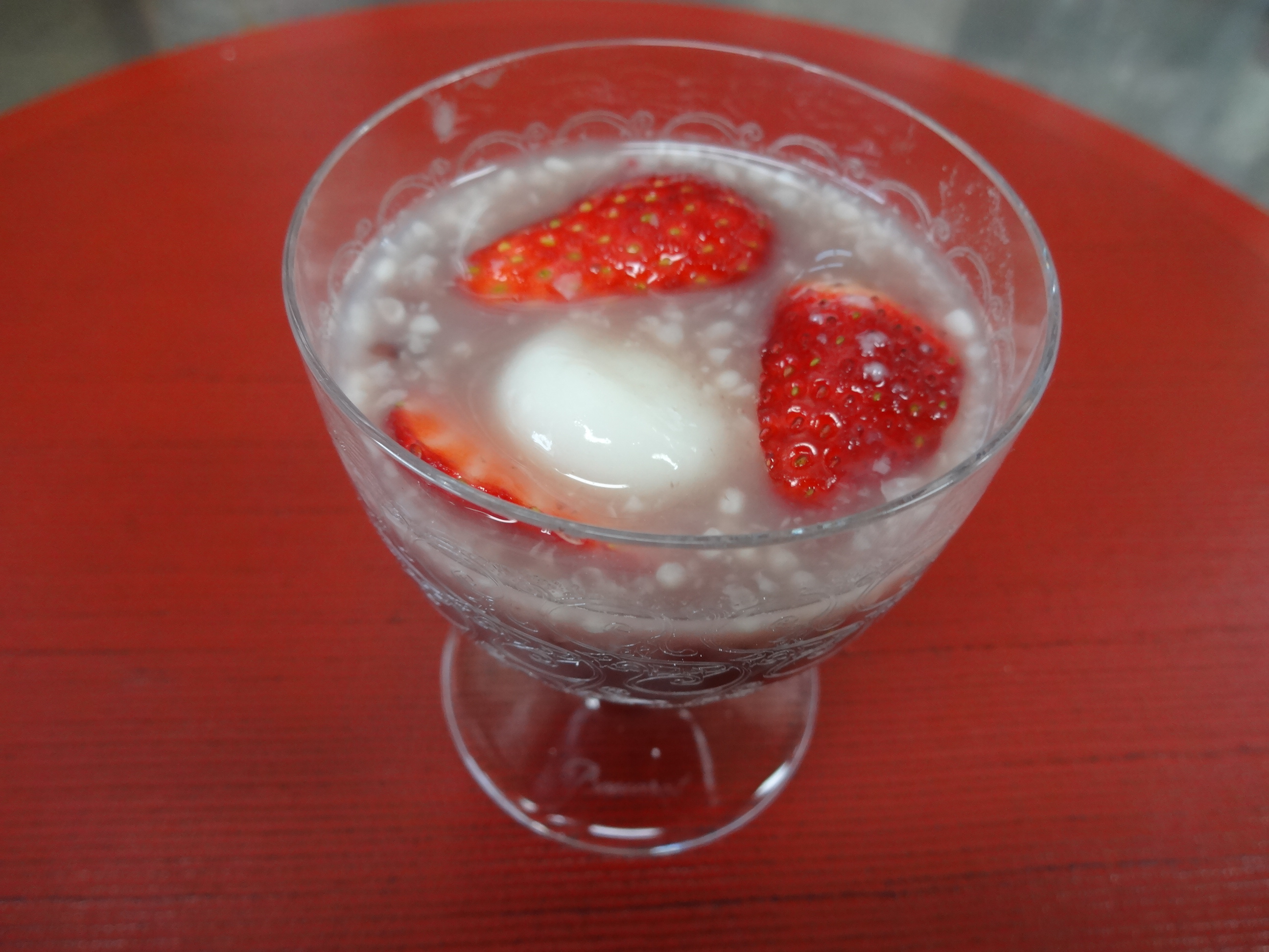 先生がサプライズで、デザートを作って下さいました。〝麹を使った甘酒白玉苺〟です。フルコースのランチとなり参加者一同お得感いっぱいの講座に大満足でした!!