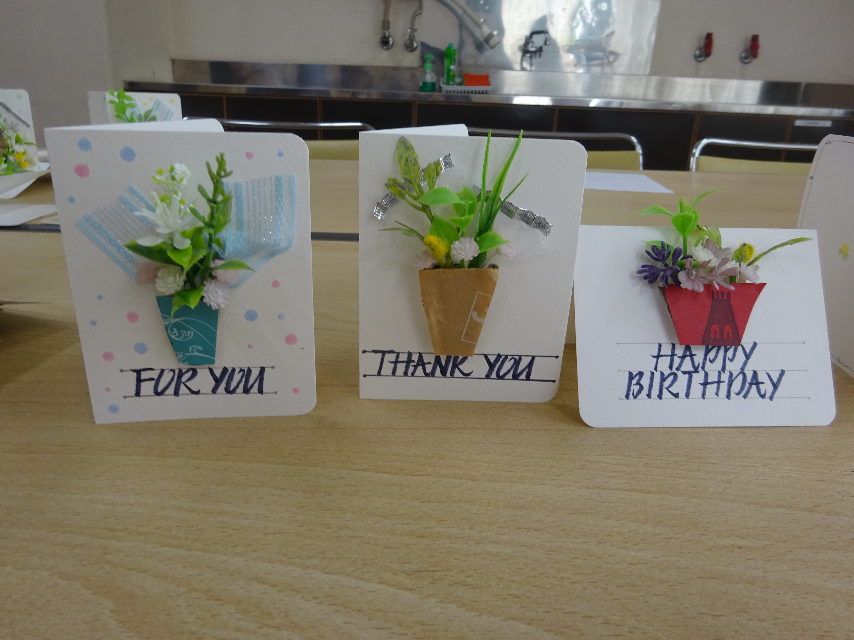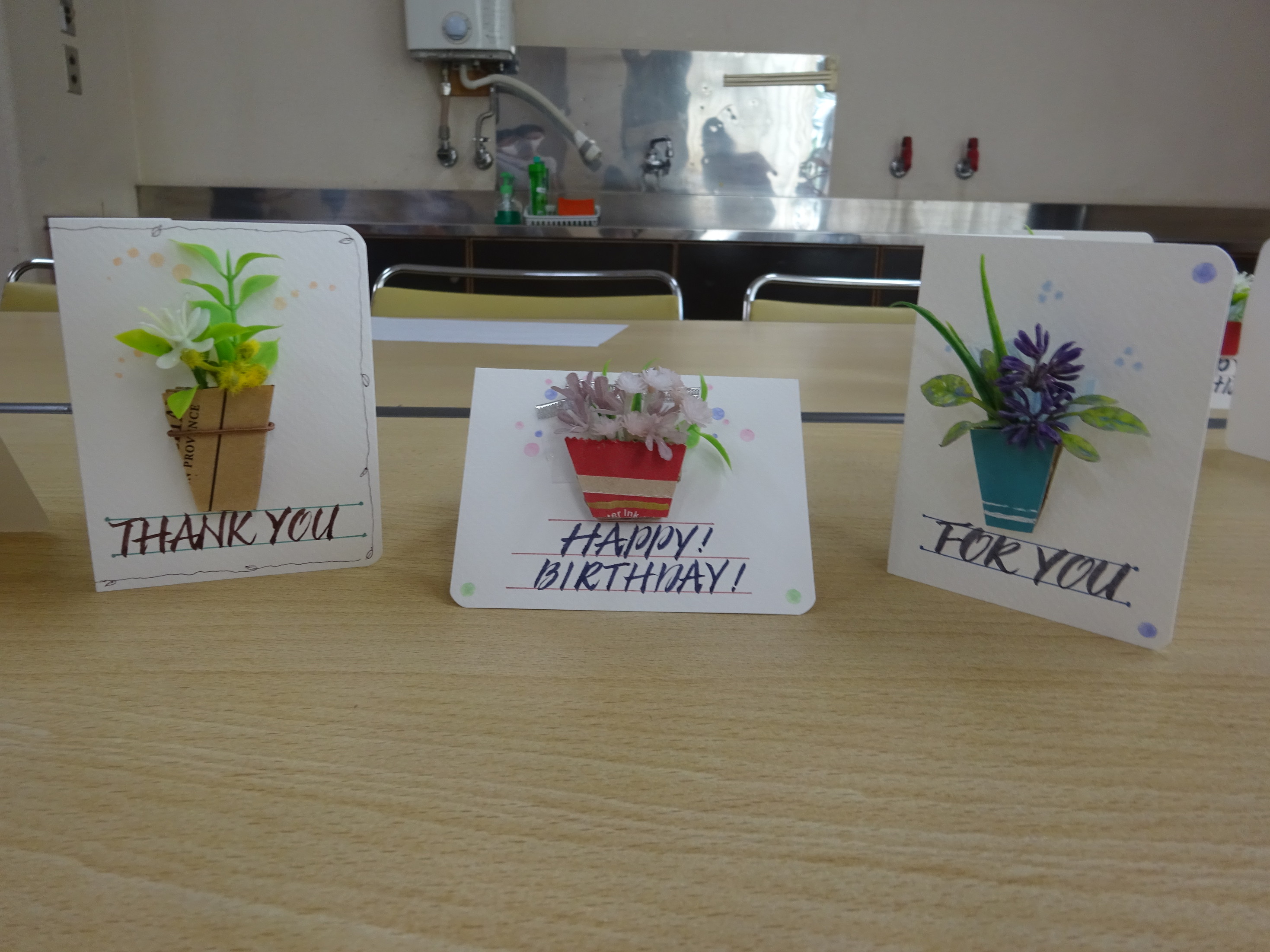 申し込みが多く人気の講座 専用の筆ペンを使って、美しく読みやすい文字を書き、 花飾り付きのカード作り体験講座を開催しました。 基本の文字を練習をし、おしゃれなカードが出来上がり 参加者のみなさまに喜ばれていました。