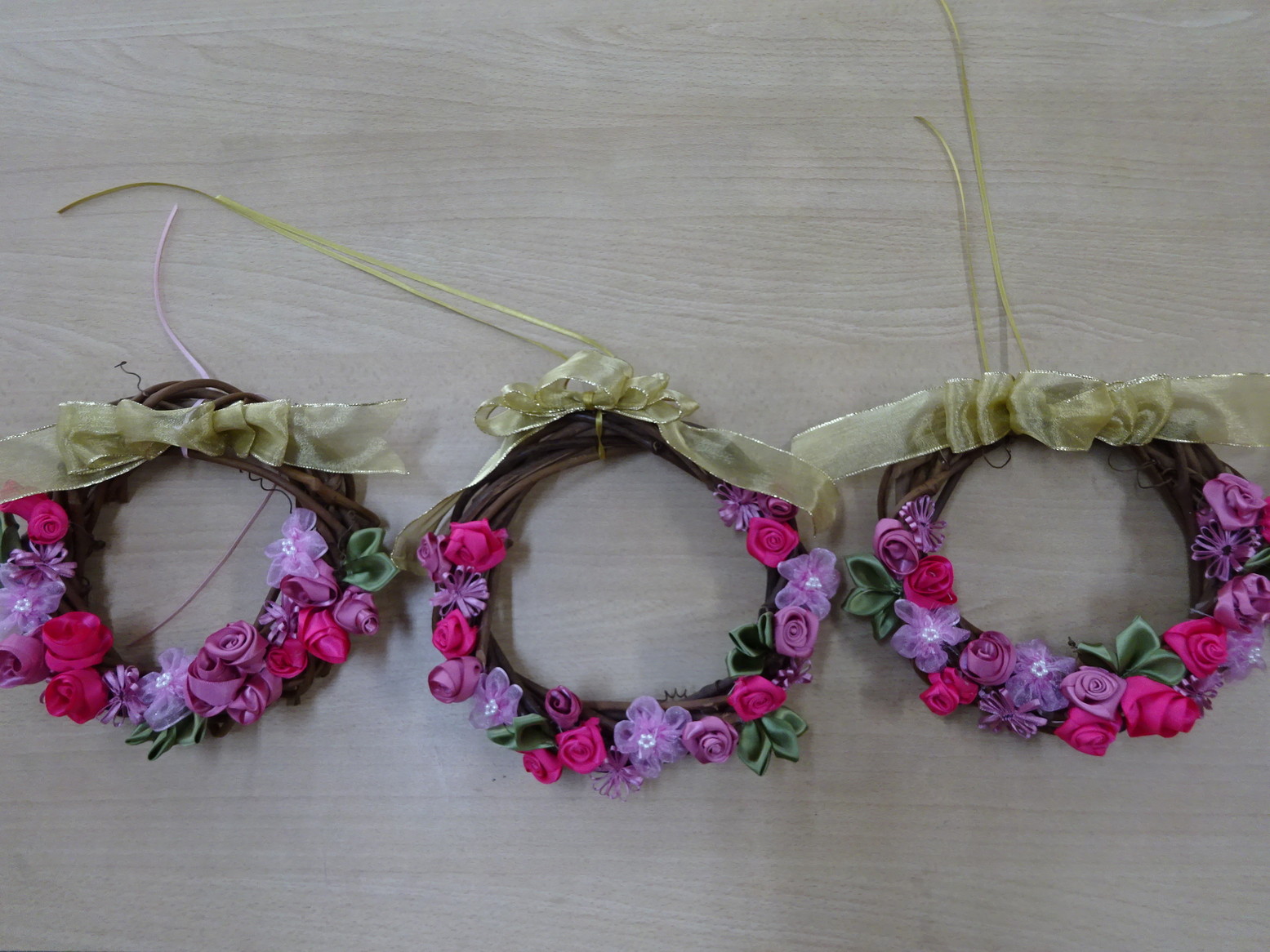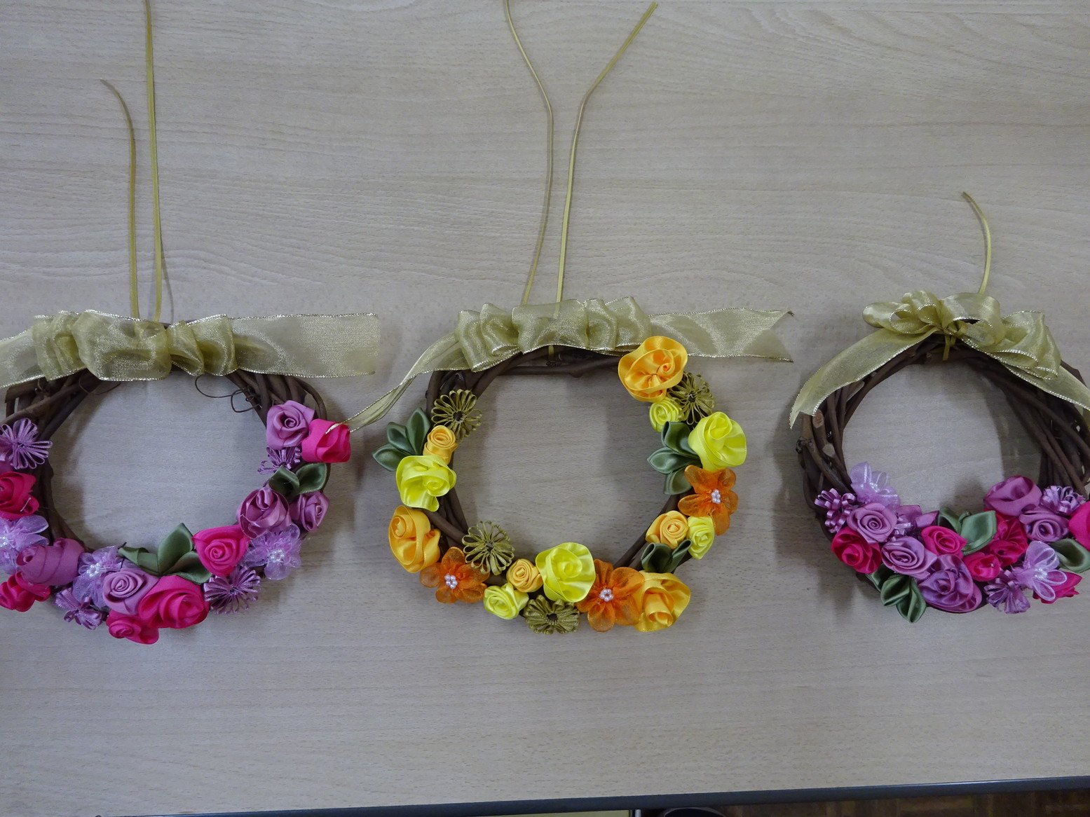 リボンで花や葉の形を作って 春らしいリースを作りました。 参加者のみなさん 華やかで素敵なリースが出来上がり 喜ばれていました。 飾るのが楽しみですね!