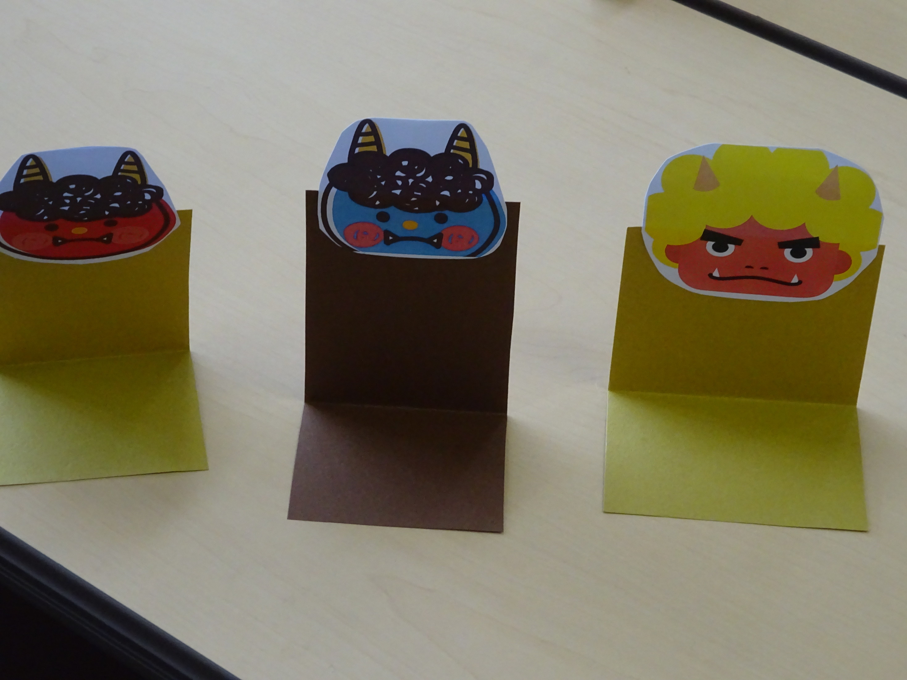 節分のお話を聞いたり 空気砲を工作して 赤おに 青おにを みんなで退治して遊びました。