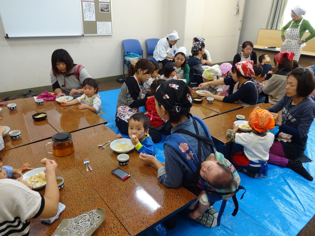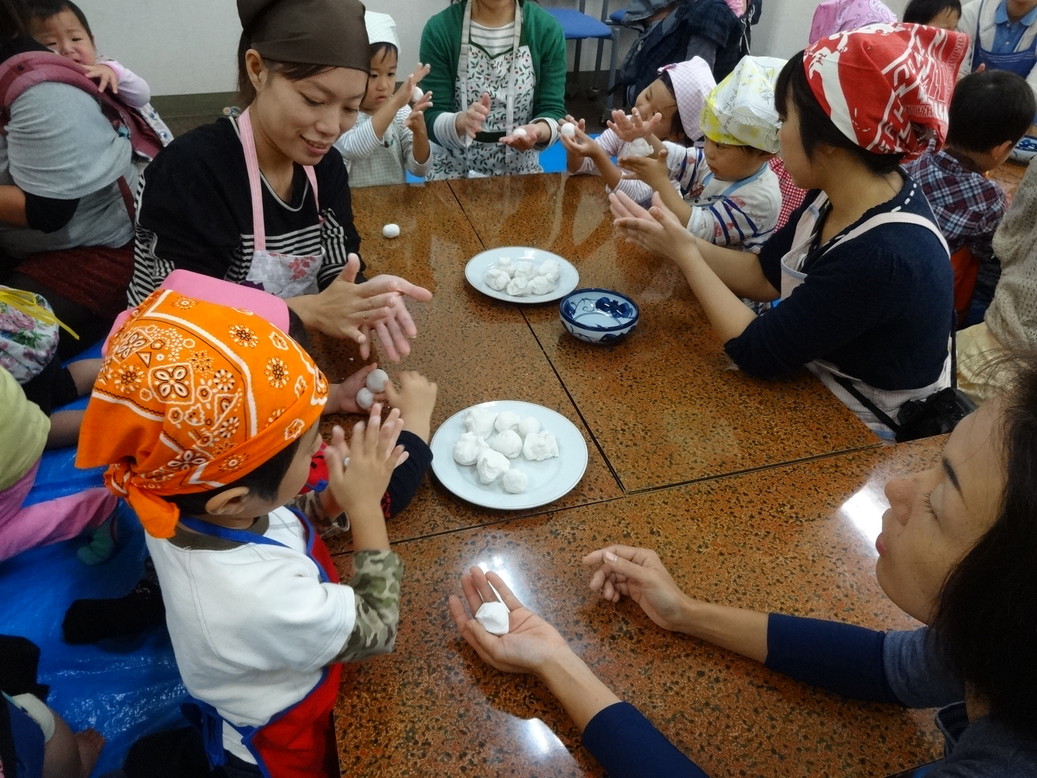 親子で楽しくお団子を作りました。 15夜、13夜のお月見やや行事食について講師からお話を伺いました。 お団子をみんなで丸めてこねこね・・・それを蒸し器で蒸して 黄な粉をつけていただきました。 出来立てのお団子はやわらかくてとってもおいしそうでした。 ぜひ、お家でも作ってくださいね。