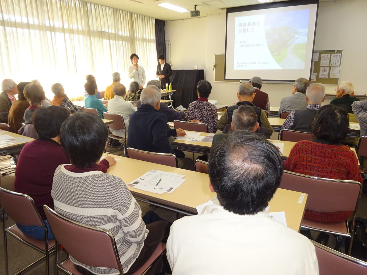 長津田厚生総合病院 消化器内科医師 中野間 絋 医師による 健康講座を開催しました。 「健康長寿」になるための食事 消化器がん予防 胃の検査など、 分かりやすく講話をしていただきました。 参加者のみなさん 最後に多くの質問をされていて 熱心に聞かれていました。