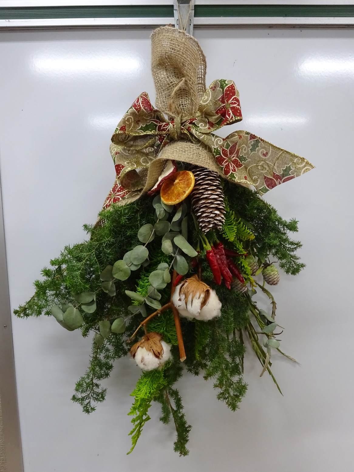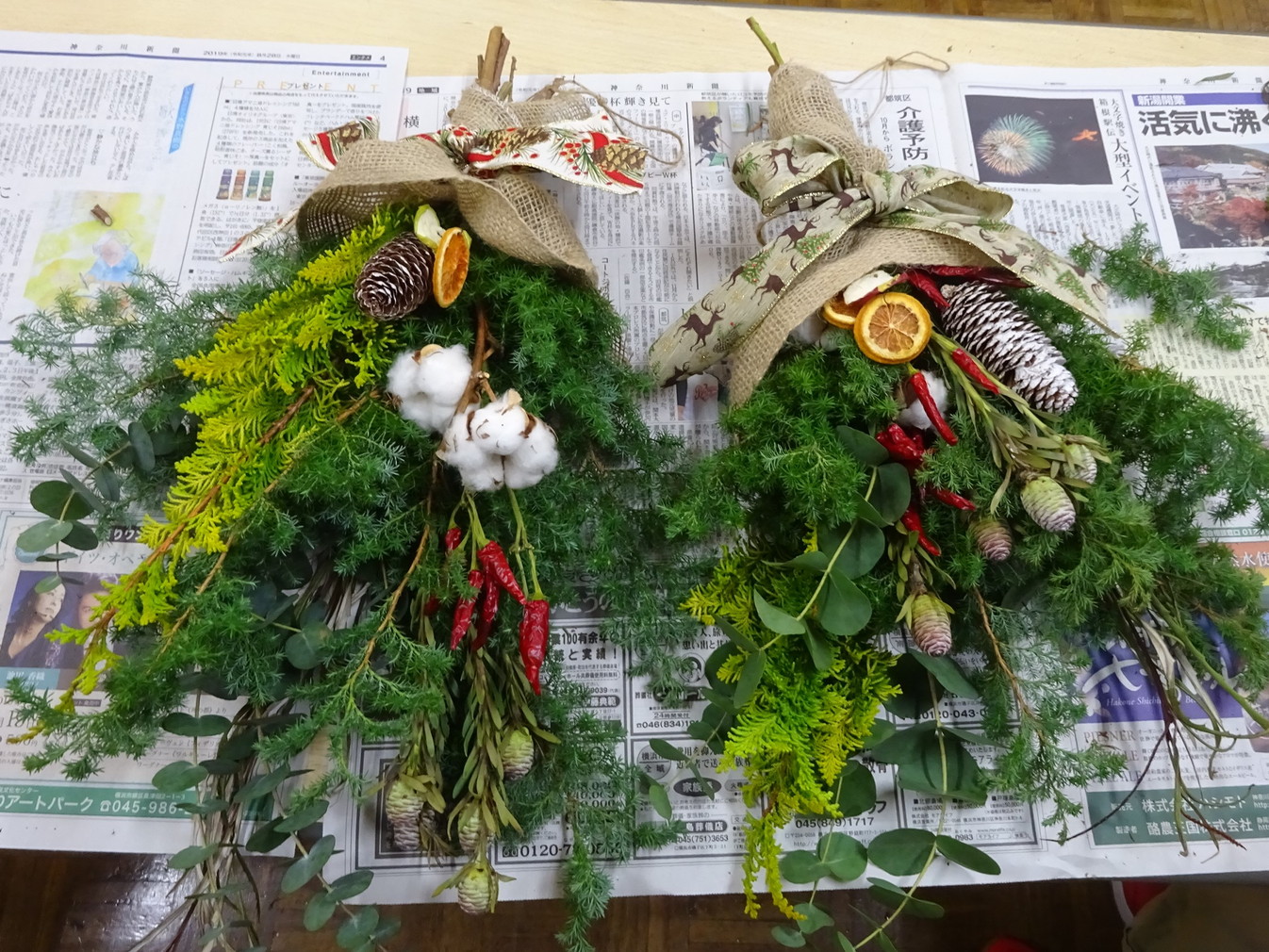 申し込みが多く大変人気の講座に なりました。 外国では伝統的なクリスマス飾り 日本でも大人気! グリーンの植物やまつぼっくり ドライフルーツなど束ねて おしゃれなリボンで結び クリスマスにピッタリな飾りが 出来上がりました。 参加者のみなさん 豪華なクリスマス飾りが出来上がり とても喜ばれていました。