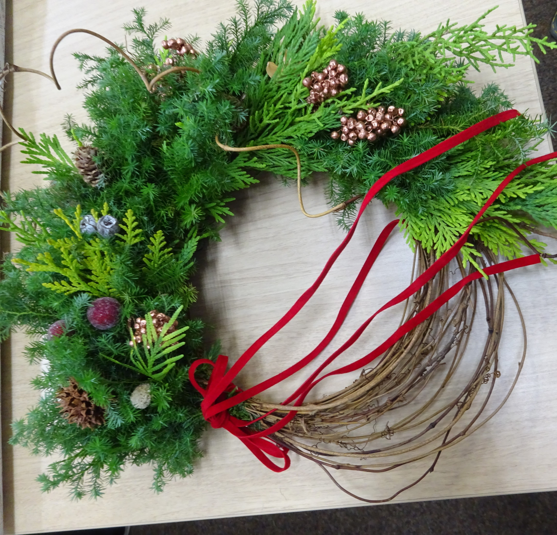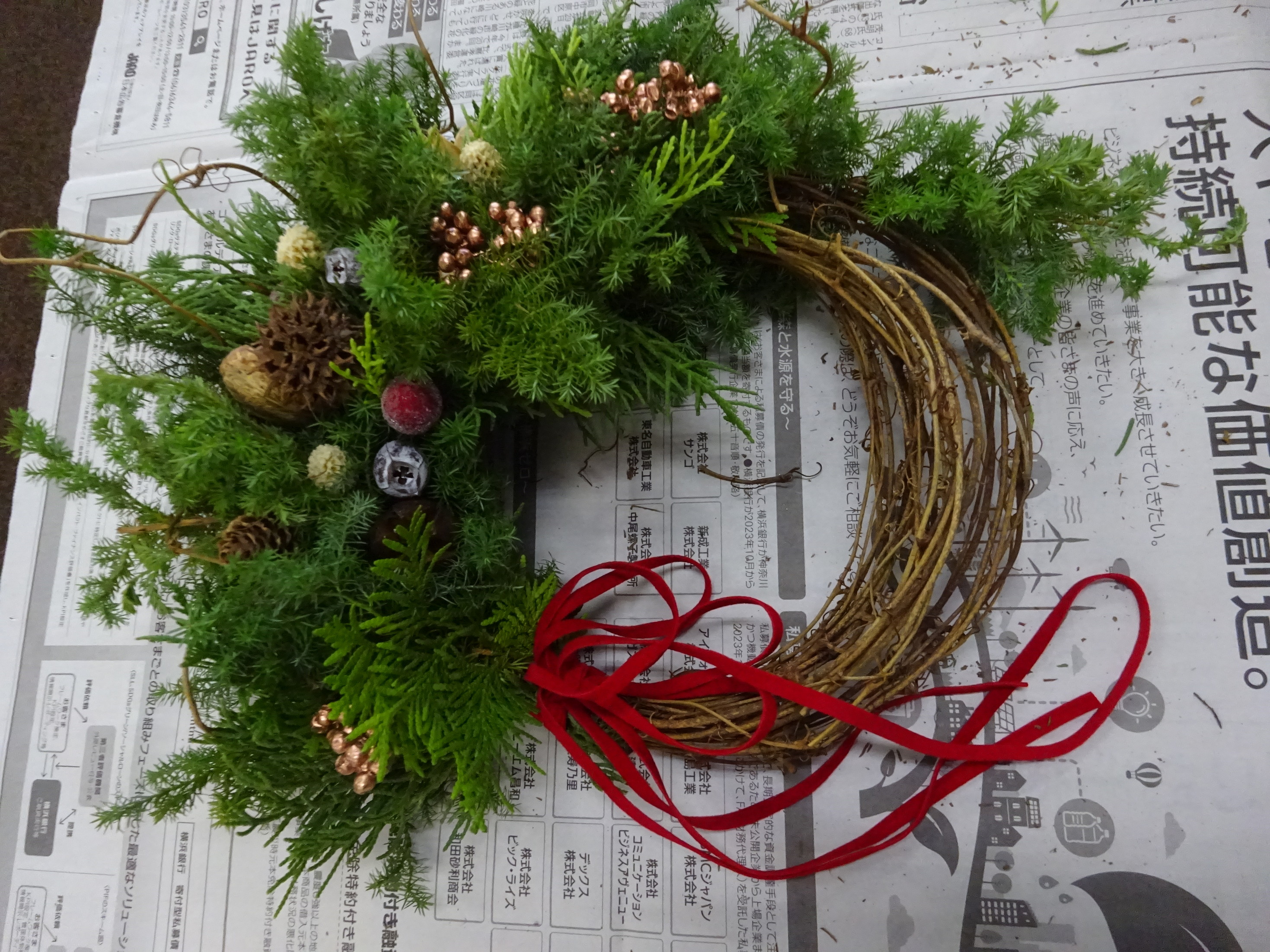 申込みが多く人気の講座 お花屋さんによるクリスマスアレンジメント リース作り ヒバやスギを使い木の実や小物を付け、 三日月型リースで素敵なリースが出来上がりました。