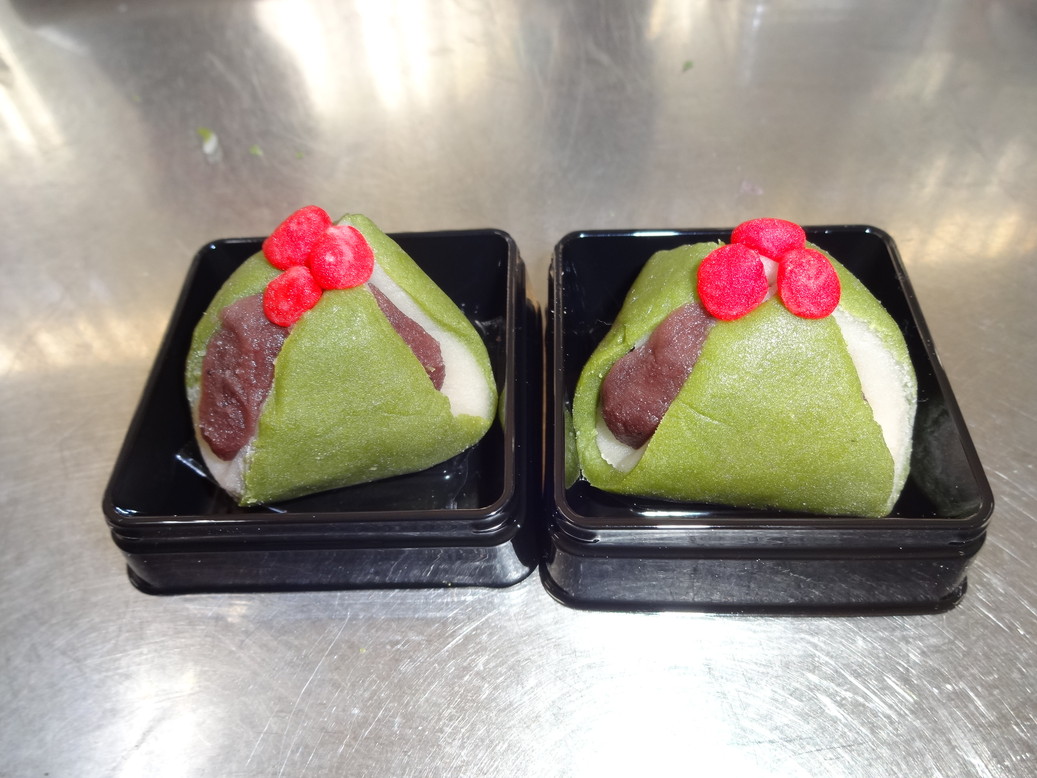 最後にあんこを包み、赤いなんてんを上に乗せ完成しました。