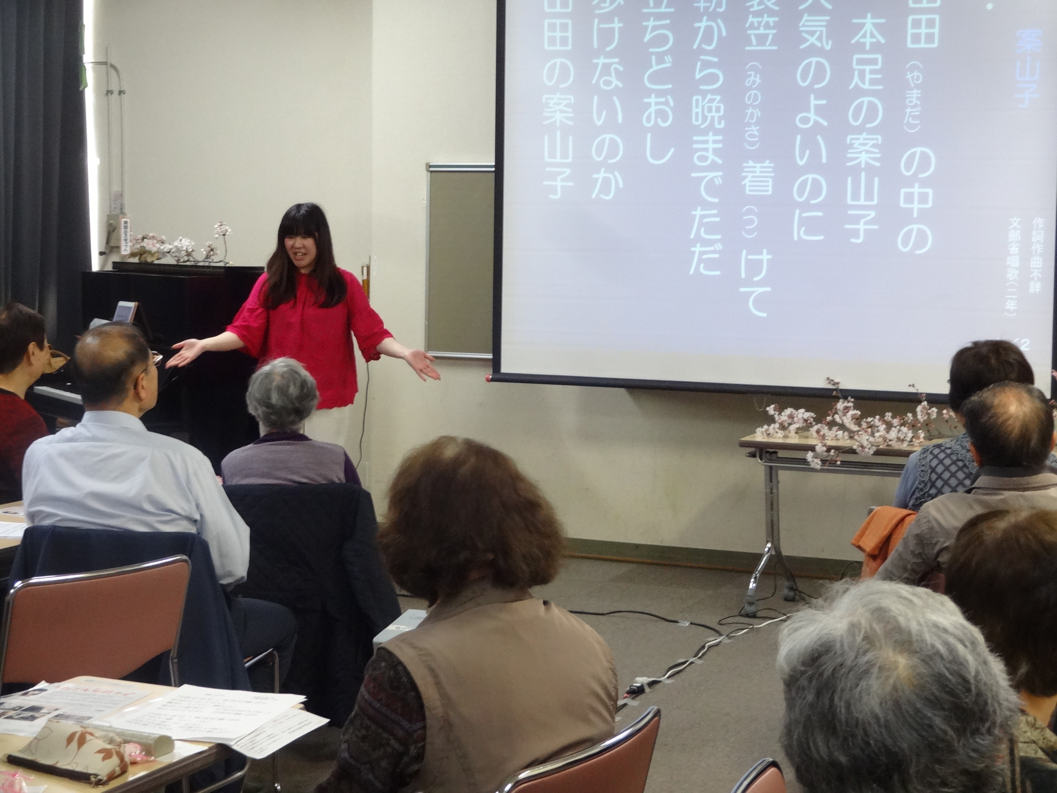 音楽療法士 ひろせめぐみ氏のピアノ伴奏に併せて、 大きな声で思いっきり声を出して、3月に相応しい沢山の歌を、 ひろせ氏と共に楽しく歌いました。 途中で教えていただいた脳トレでは、四苦八苦する場面もありましたが、全員なんとかクリアできました。 合格です。 ピアノ伴奏で大声で歌えてうれしい! 毎月2回程この会を開いてほしい! とっても楽しかったので、またお願いします! などの感想を参加者の皆さんからいただきました。