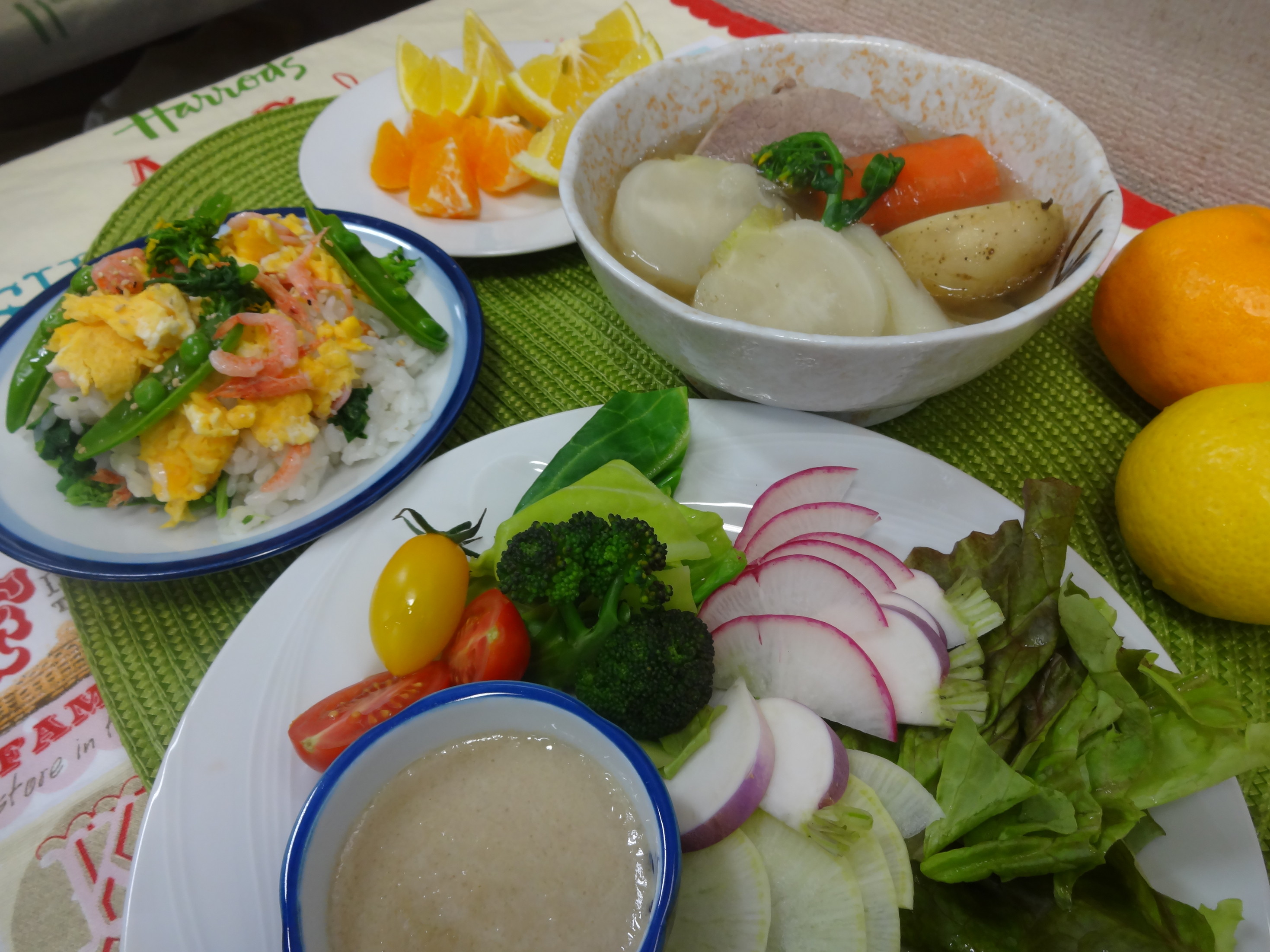 きれいなちらし寿司と暖かいポトフ、春野菜のバーニャカウダに数種の柑橘 今日は、春のランチにふさわしいとは残念ながら言えないお天気になりましたが、ある意味春の風と雨が降る中の教室になりました。 料理室の中はまさに春色に彩られたごちそうを召し上がっていただきました。