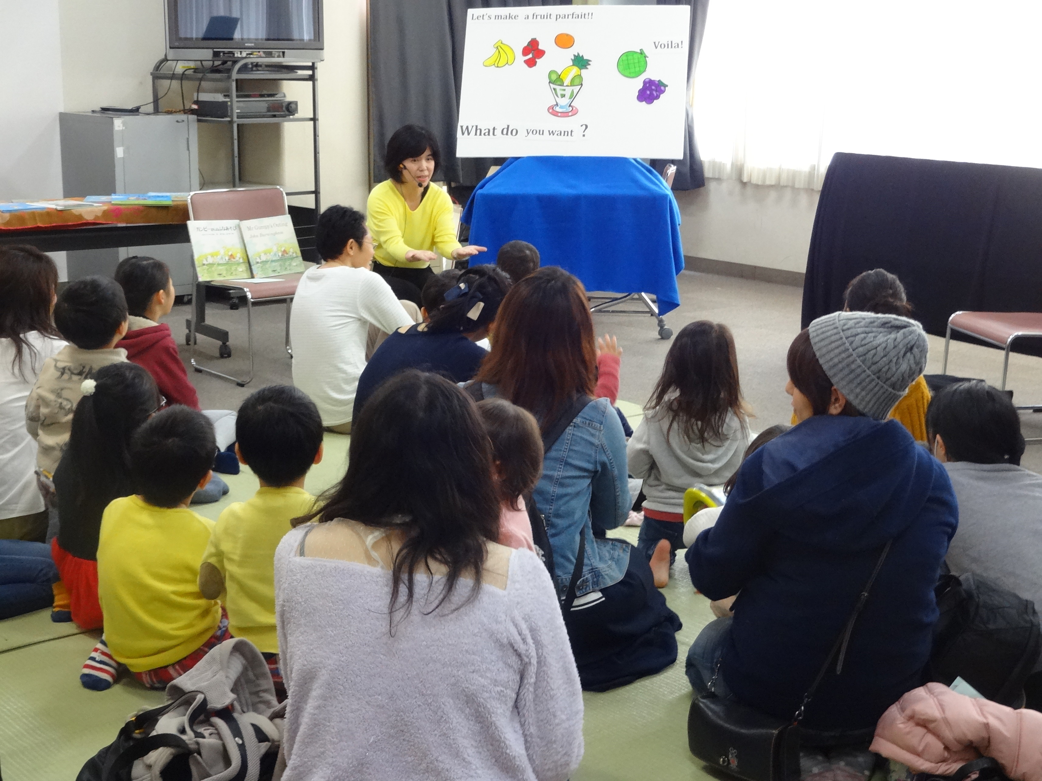 絵本をつかって楽しむ英語と日本語の読み聞かせを行いました。 楽しい絵本やパネルシアターを英語のリズムや音楽と共に楽しみました。 参加型のパネルシアターでは、子どもたちの盛り上がりが頂点に達していました。 20冊程の絵本の展示にママたちは、興味を示し、 子どもたちは、生音楽で使用した様々な楽器に興味深々・・・ 日本語・英語・音楽を同時に楽しむことができました。