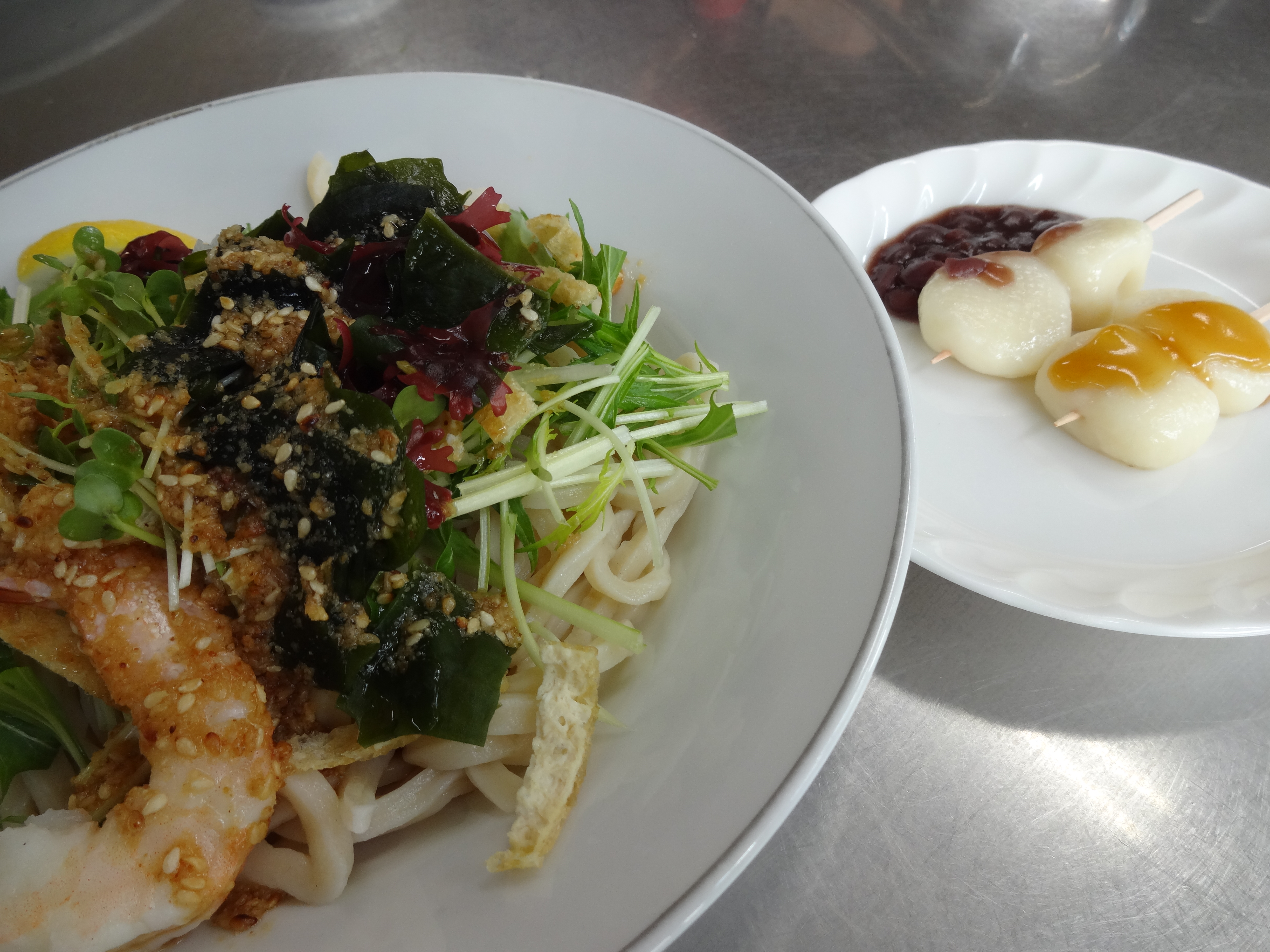 サラダうどんのように、野菜をのせてごまだれをかけていただきました。 うどんをご家庭で打てるって、自慢したくなりますね。 豆腐入りの白玉だんごもたれに八方出汁を入れているのでとてもおいしいです。