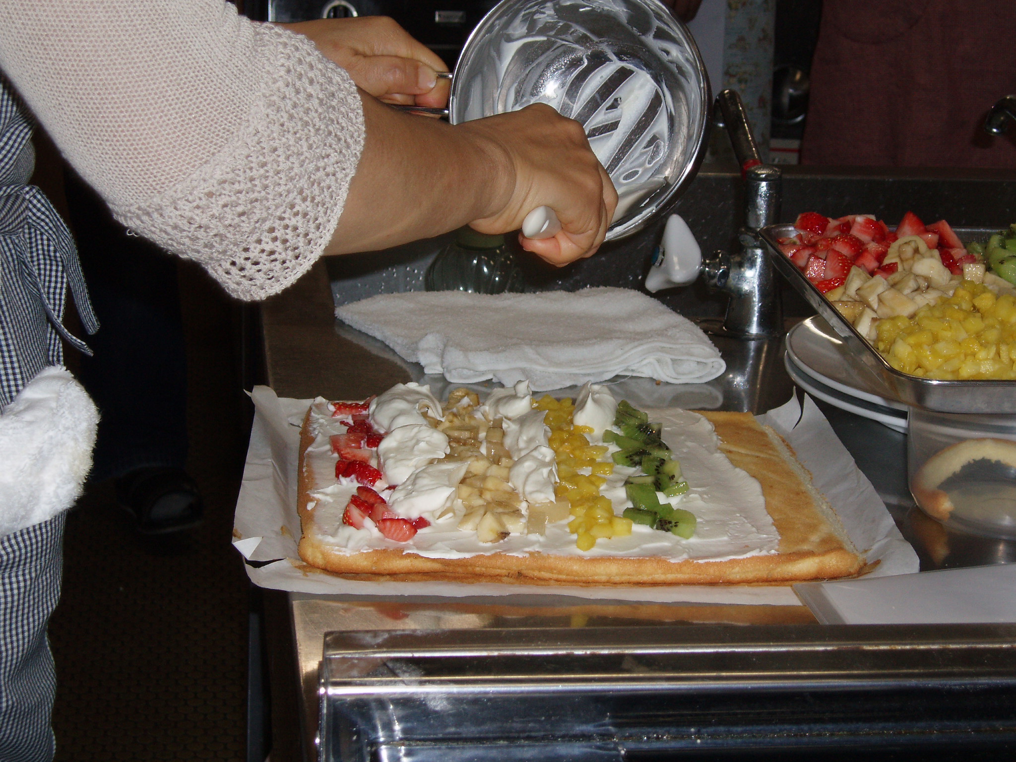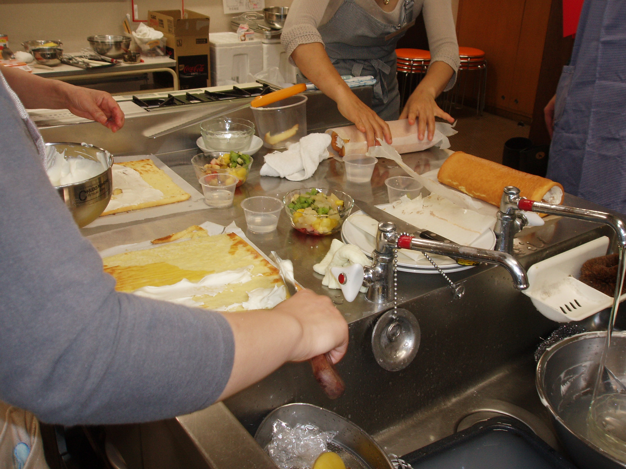 たくさんのフルーツと生クリームを上手に巻くコツを先生に伝授していただきました。