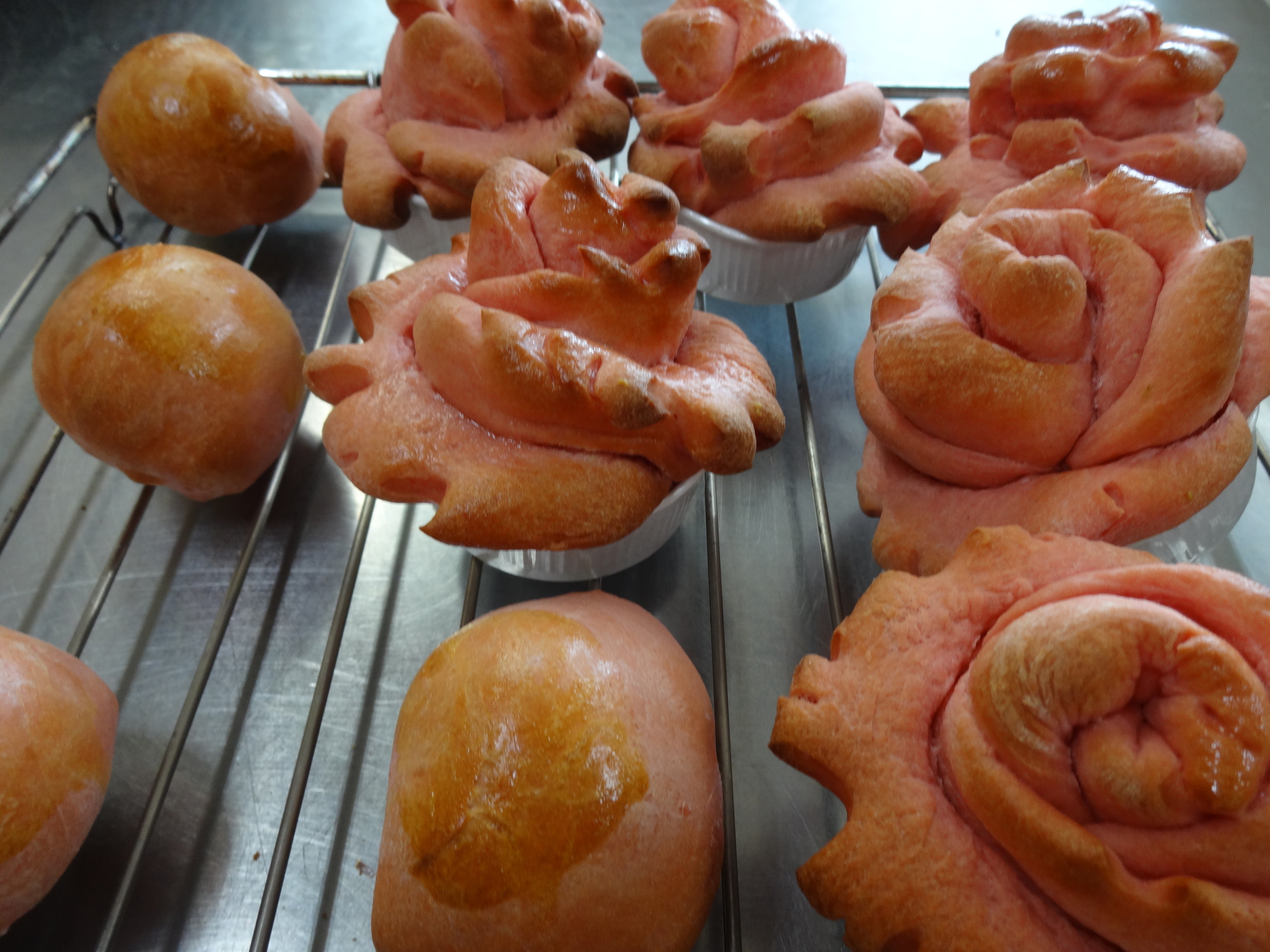 母の日のプレゼントにカーネーションのパンを作りました。 はなびらの赤は紅こうじで、葉っぱのみどりは抹茶で自然のもので色をつけました。 はなびらのようにパン生地をくるくるまいて、中にはクリームを入れました。 素敵なカーネーションパンの出来上がりです。 難しかったけど一生懸命作りました。きっと、お母さんは喜んでくれますね!