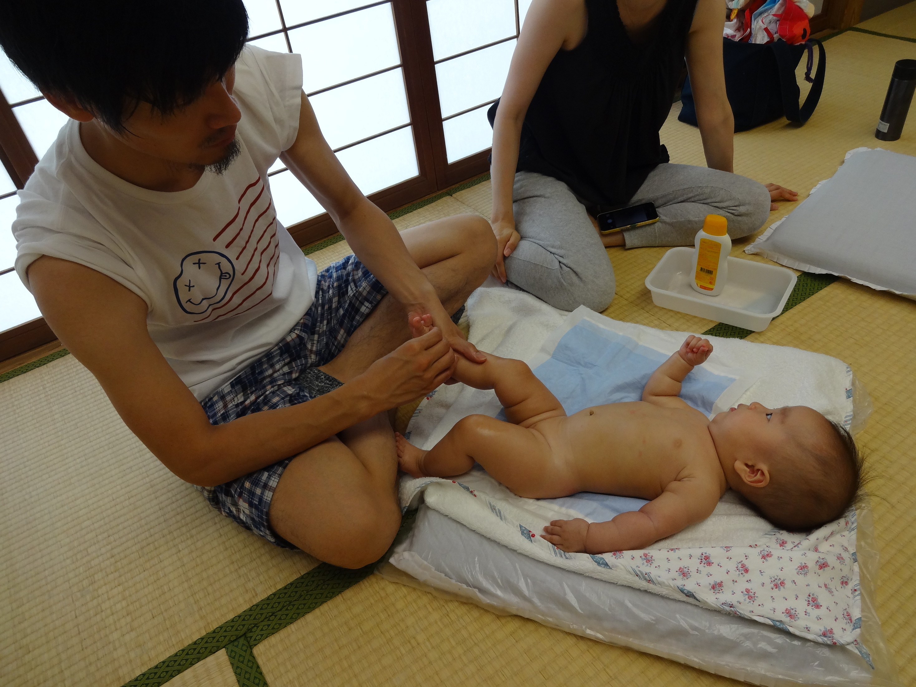 ママと赤ちゃんと楽しいひと時を過ごしていただけました。 ママの温かい手で赤ちゃんをマッサージ、気持ちよさそうにおとなしくしていましたよ。 最後はパパの登場です。 大きな手に包まれてパパのマッサージもとっても気持ちいい! パパ、またお願いね❤