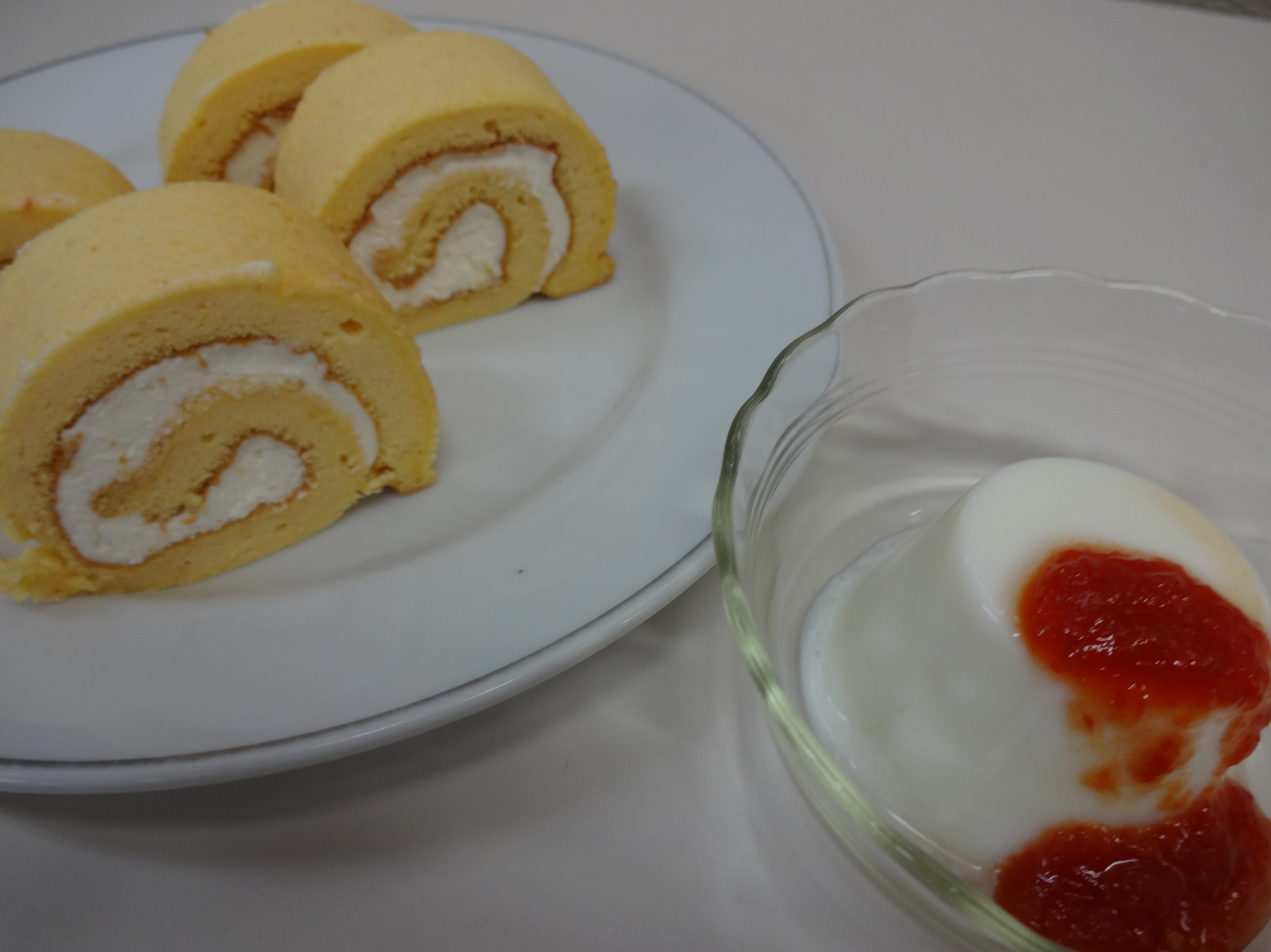 夏のお菓子ということで、本日はトマトを使ったロールケーキとミルクゼリーをつくりました。 ロールケーキににトマトをいれて、ゼリーはトマトのジャムをのせた2品を作りました。 フレッシュなトマトで軽くてちょっと酸味もある大人のデザートです。 トマトのジャムも甘さ控えめでとてもおいしくできました。