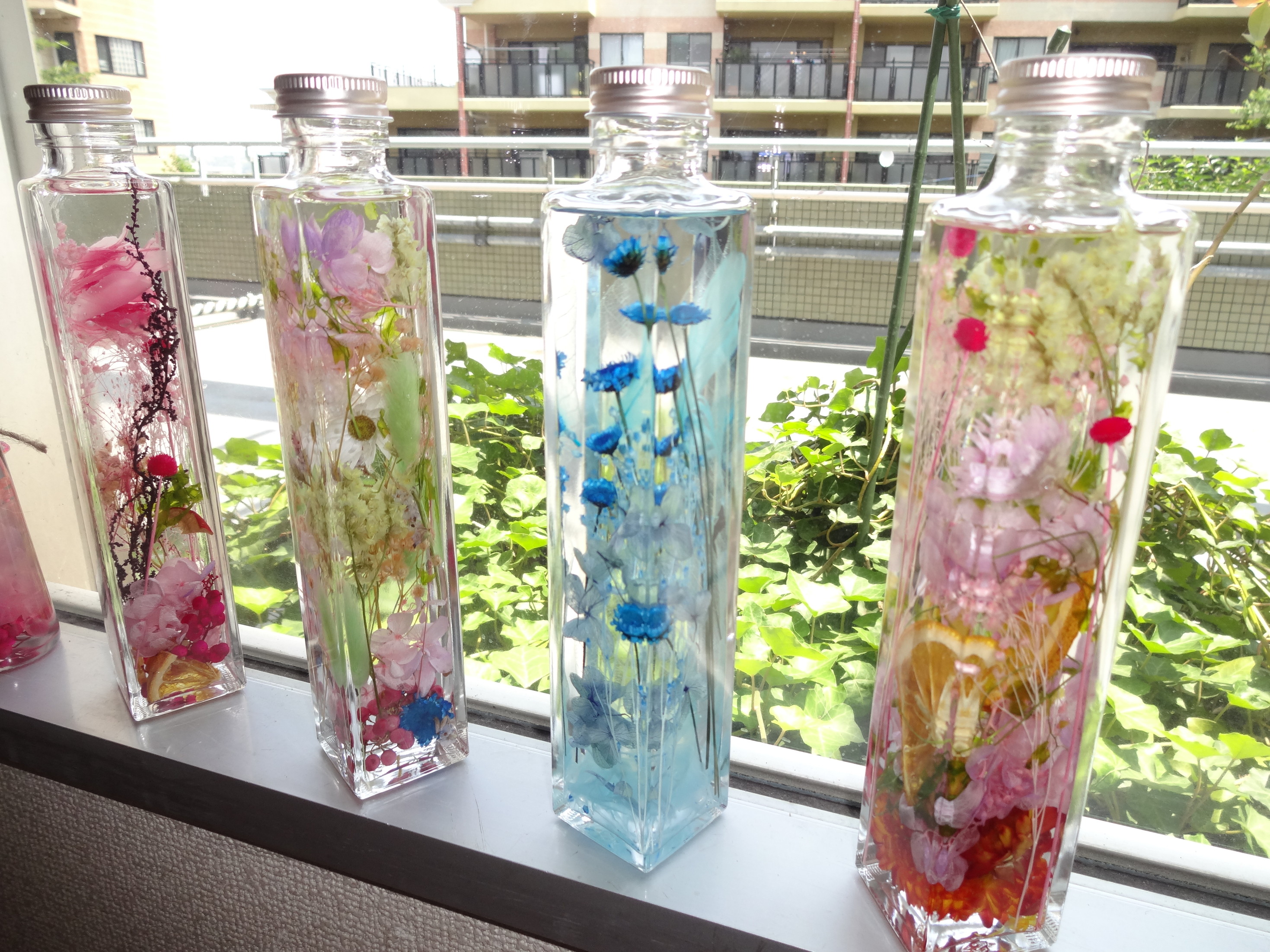 キャンセル待ちが多く大変人気の講座でした。 ガラス瓶に 色とりどりのプリザーブドフラワーやドライフラワー等 を入れてオイルに浸けて 綺麗な飾りが出来上がりました。 参加者のみなさん とても喜んで作品を作られていました。