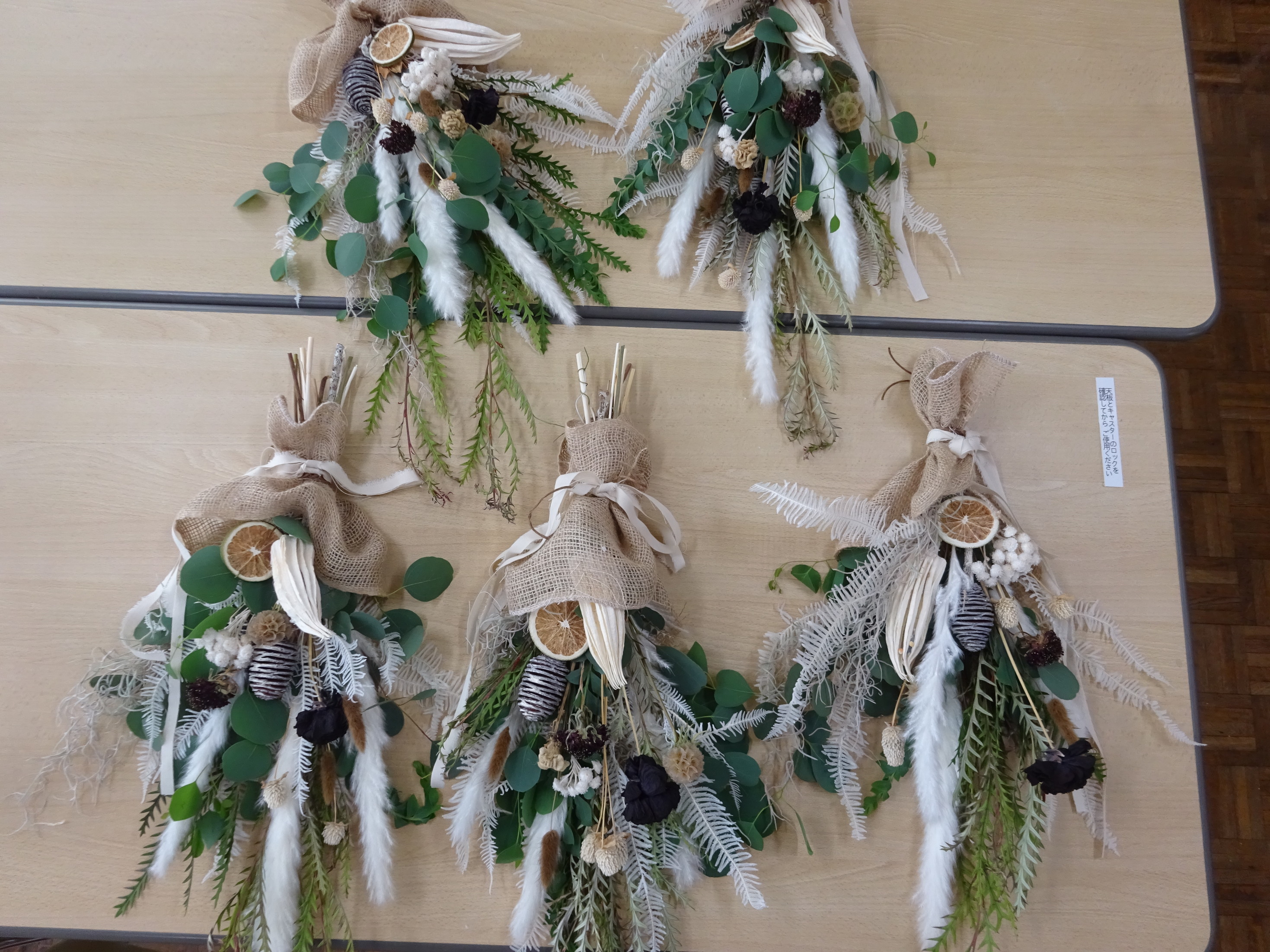 お花屋さんによる毎回好評のアレンジメント講座 涼しげで爽やかなスワッグ作り 花材の説明からスワッグ作りのポイントなどを 習いながら体験して頂きました。 素敵なスワッグが出来上がり、参加者のみなさま 喜ばれていました。