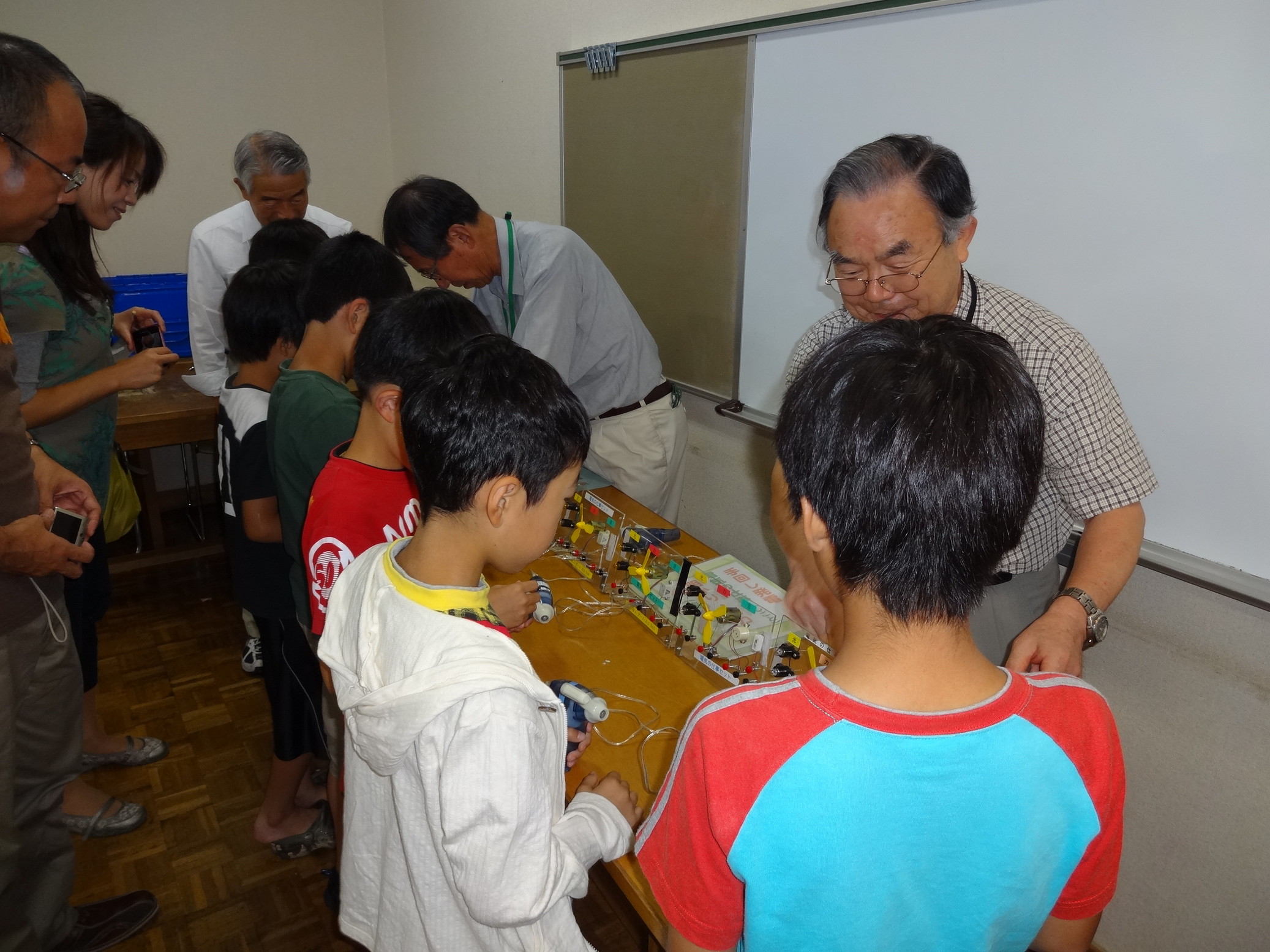 電気を作るのに、とても力というか体力がいることを実感したようです。「手が痛くなりました」と言いながらも頑張って装置を回していました。