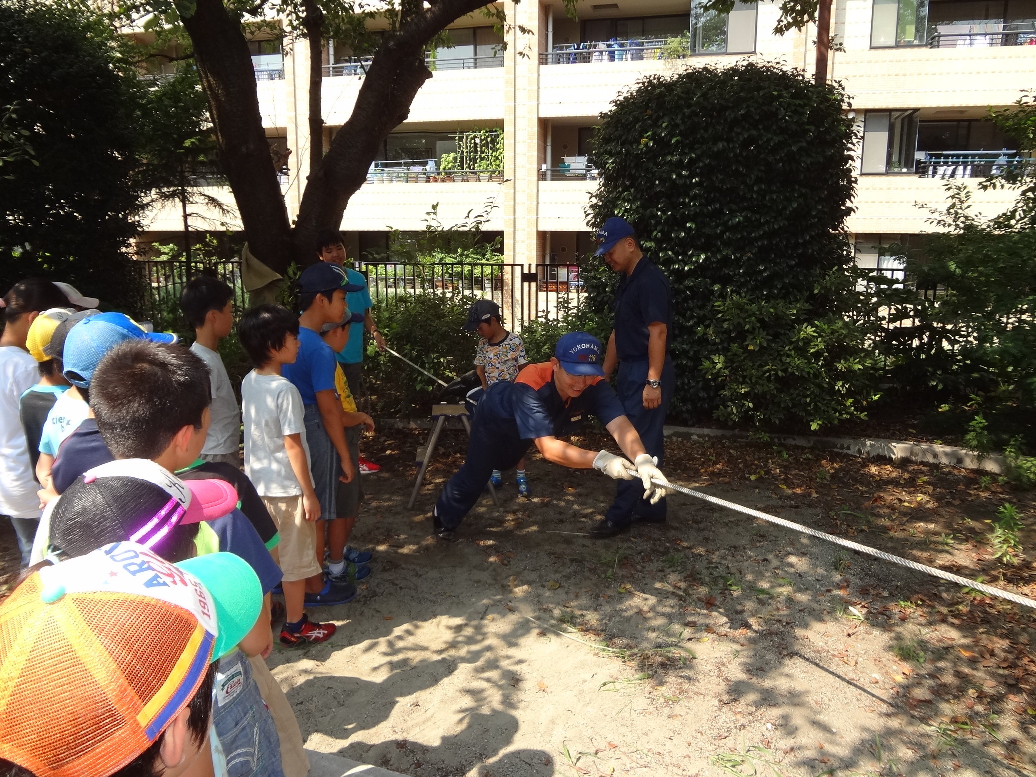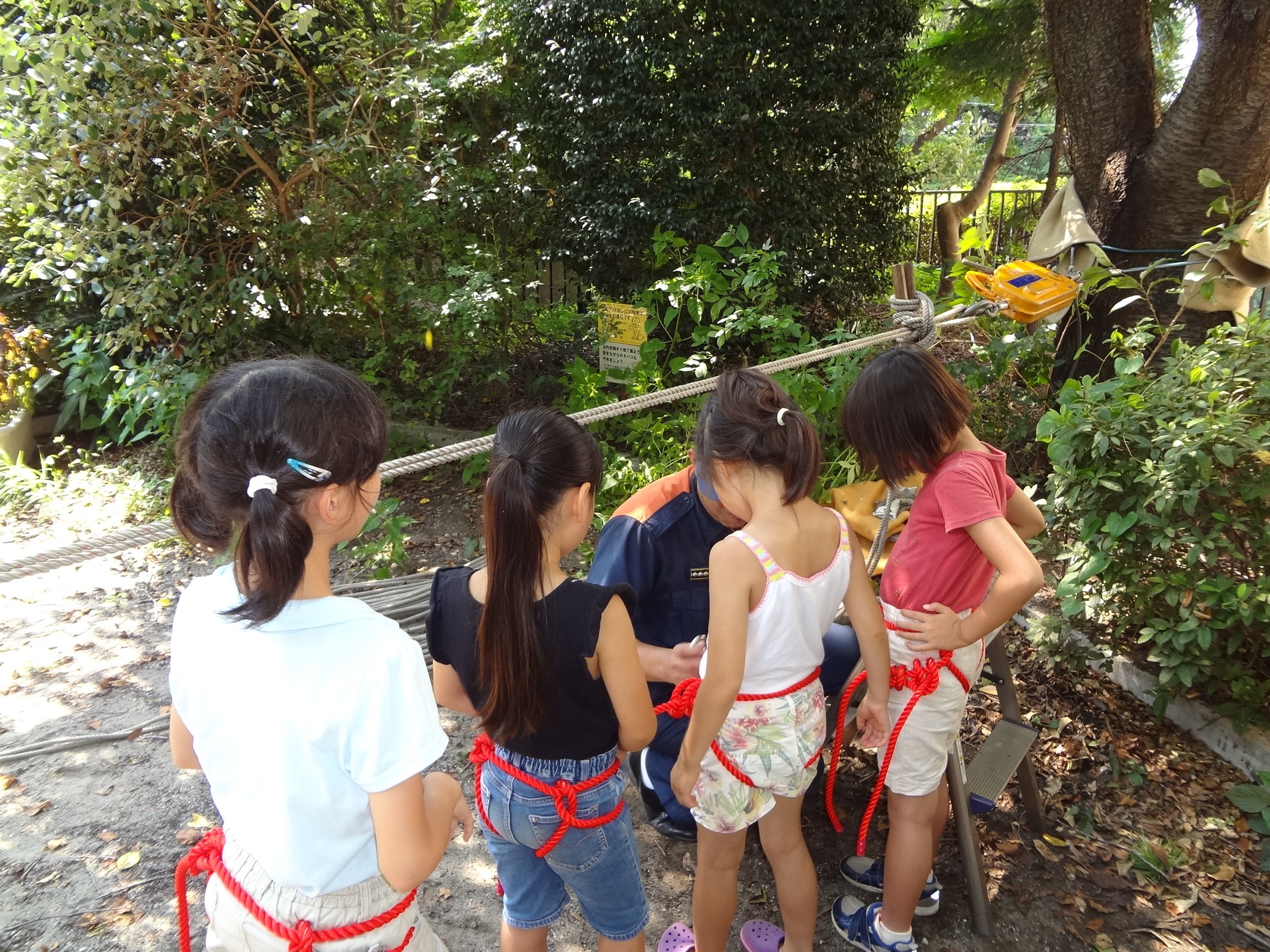 レスキュー隊のロープわたり体験や消防隊員が使用する道具を実際に使ったり見たりして災害時の感覚を体験しました。
