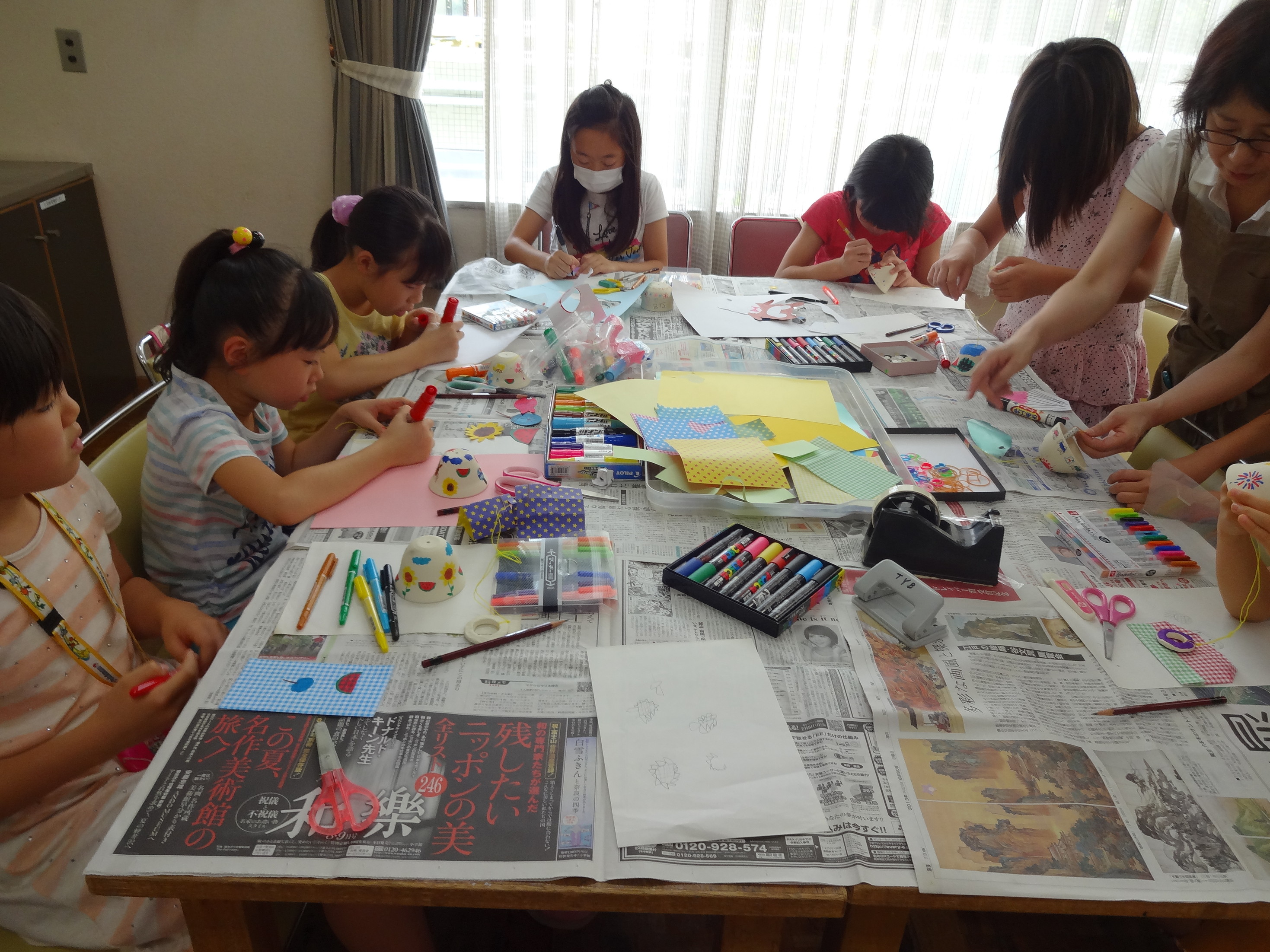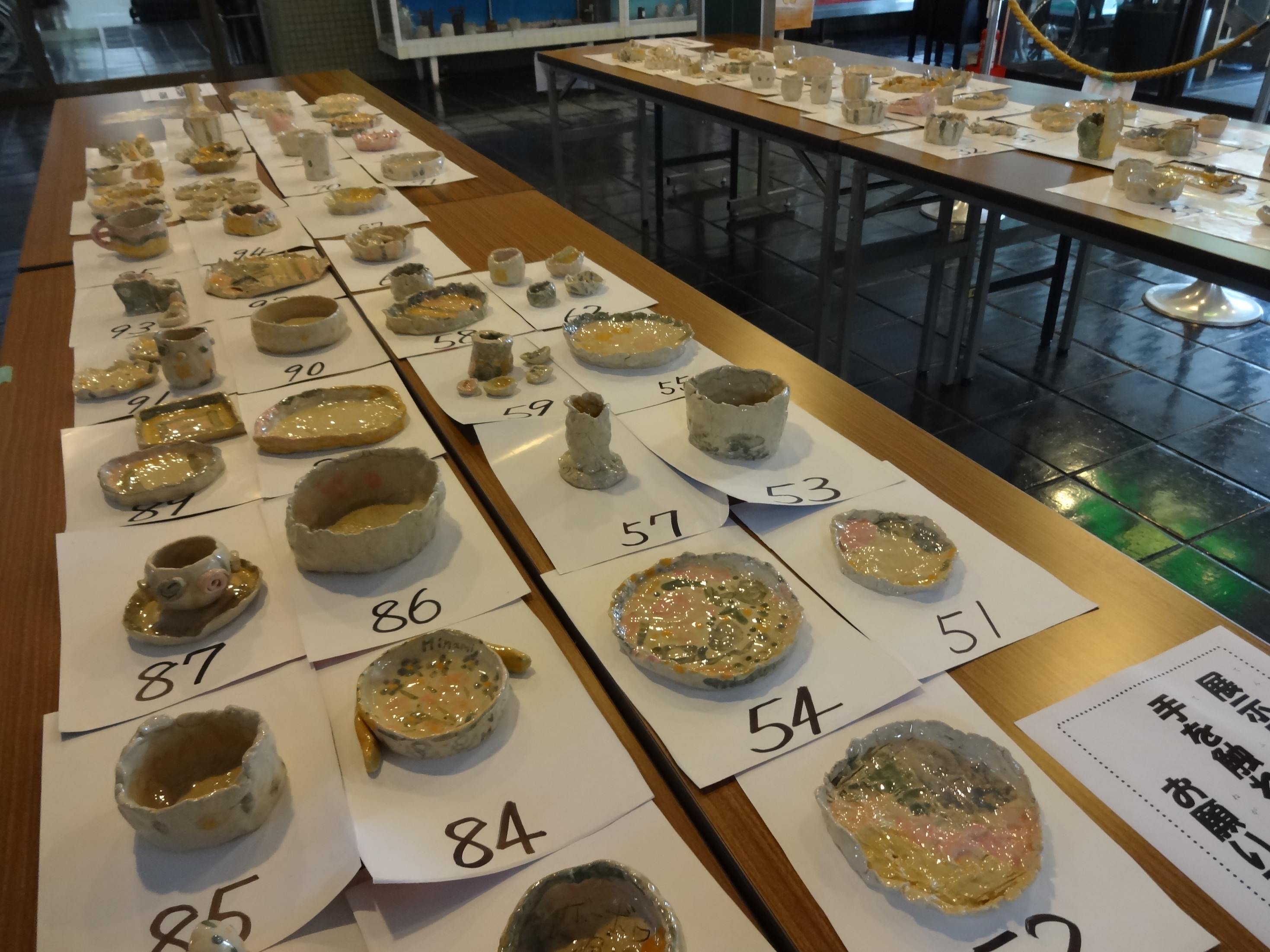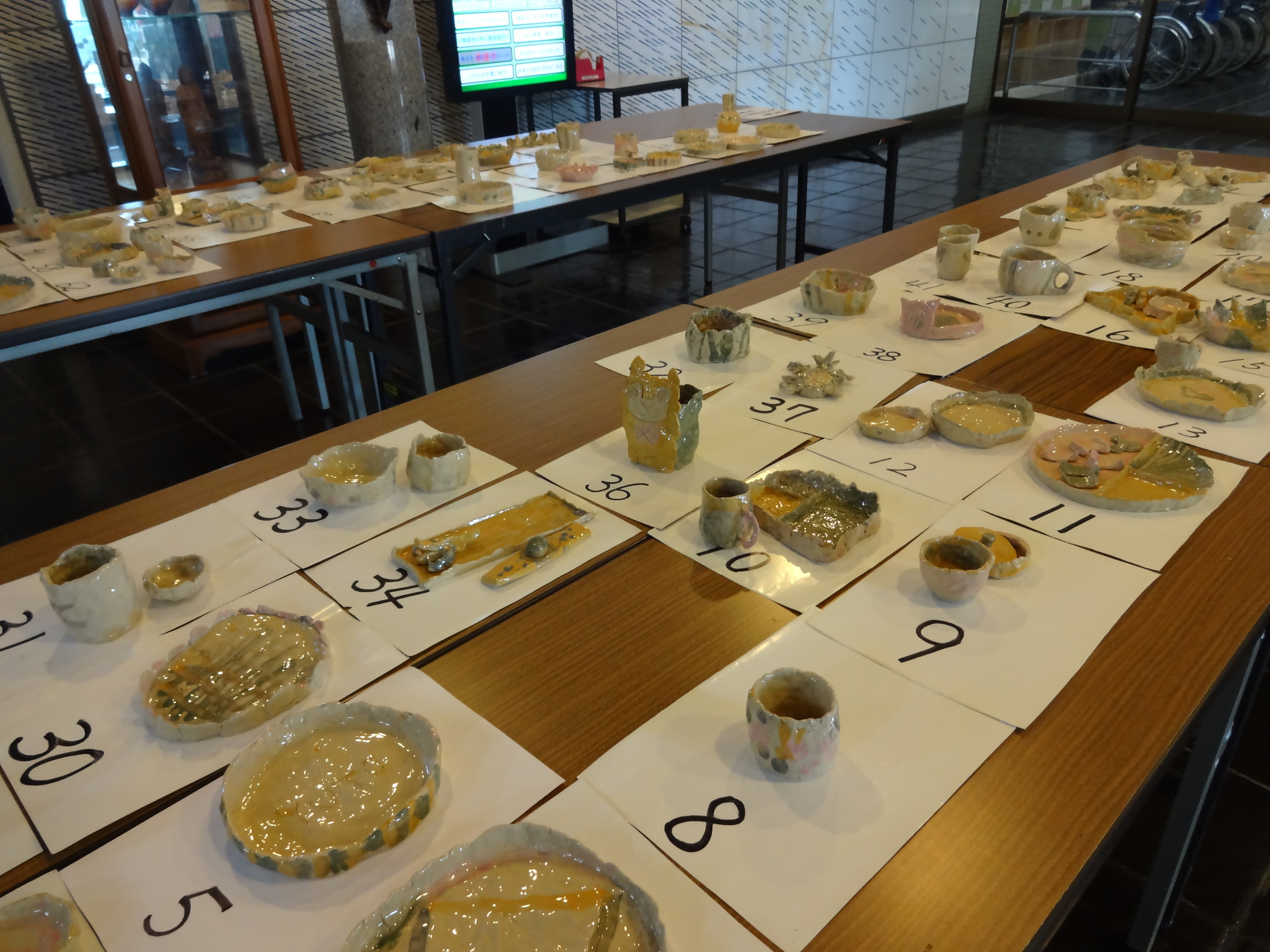 粘土から形をつくり色を塗って、陶芸家に焼いてもらいました。 お皿、コップ、箸置き、壺や置物、動物などアイデア満載でした。 おかあさんのアクセサリーもありました。 8/16.17と展示をしてただ今引き取り中!