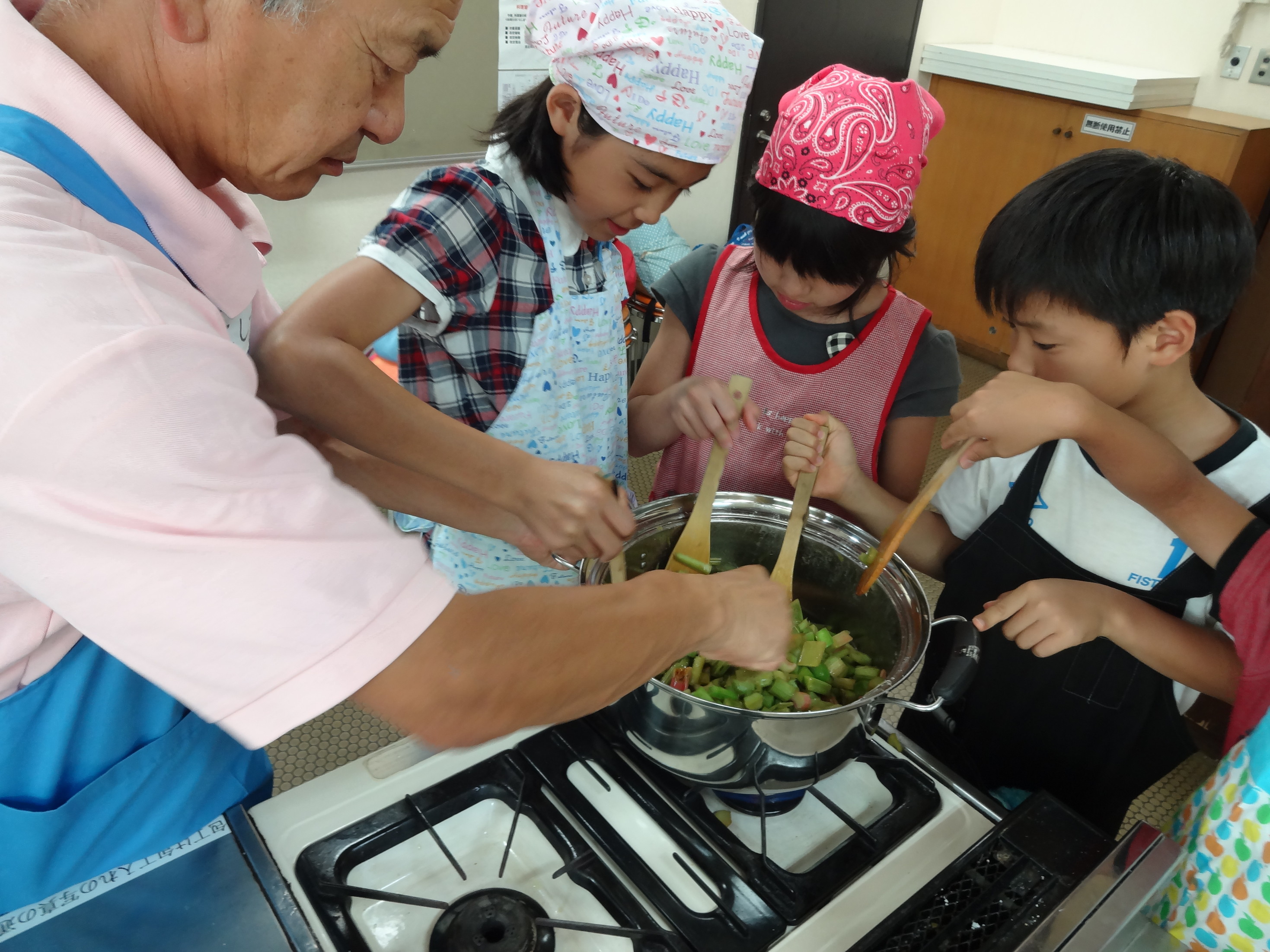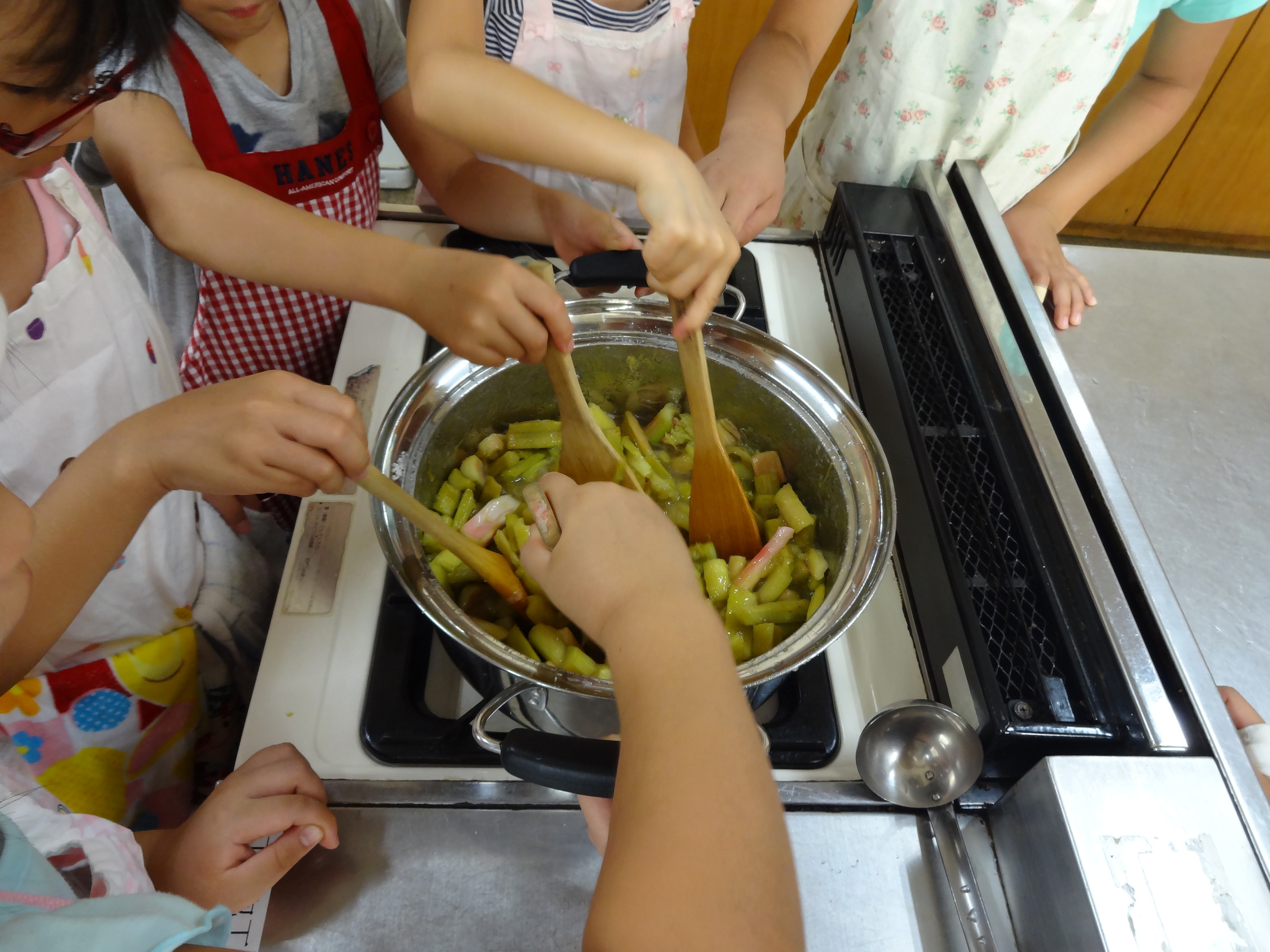 毎年恒例のルバーブのジャムを作りました。 ルバーブはとても珍しい野菜です。 低学年はポキポキと折って、高学年は包丁で切って、焦がさないように鍋を交代でかき混ぜて作りました。 砂糖とルバーブのみのシンプルなジャムですがとてもおいしいですよ。