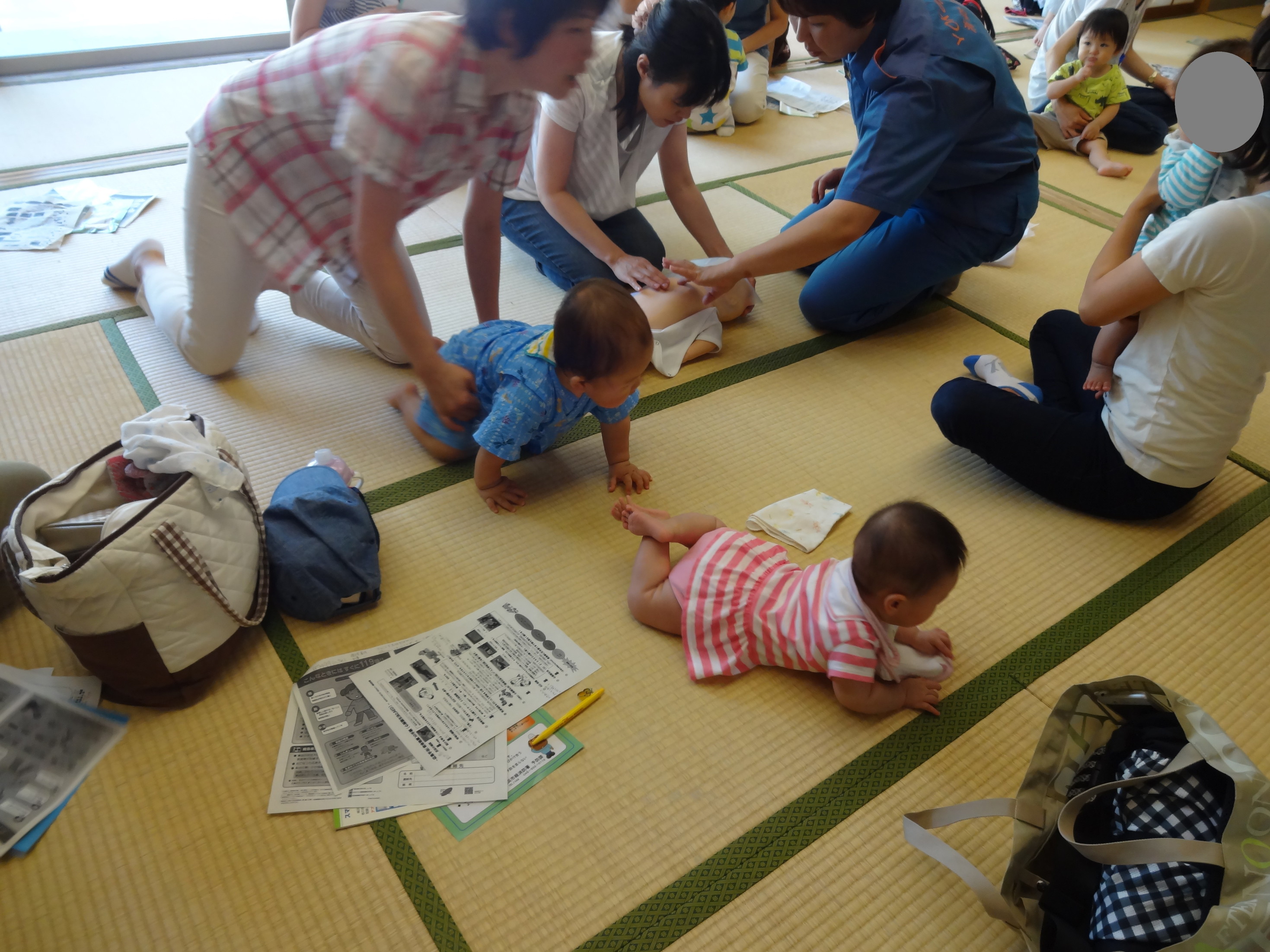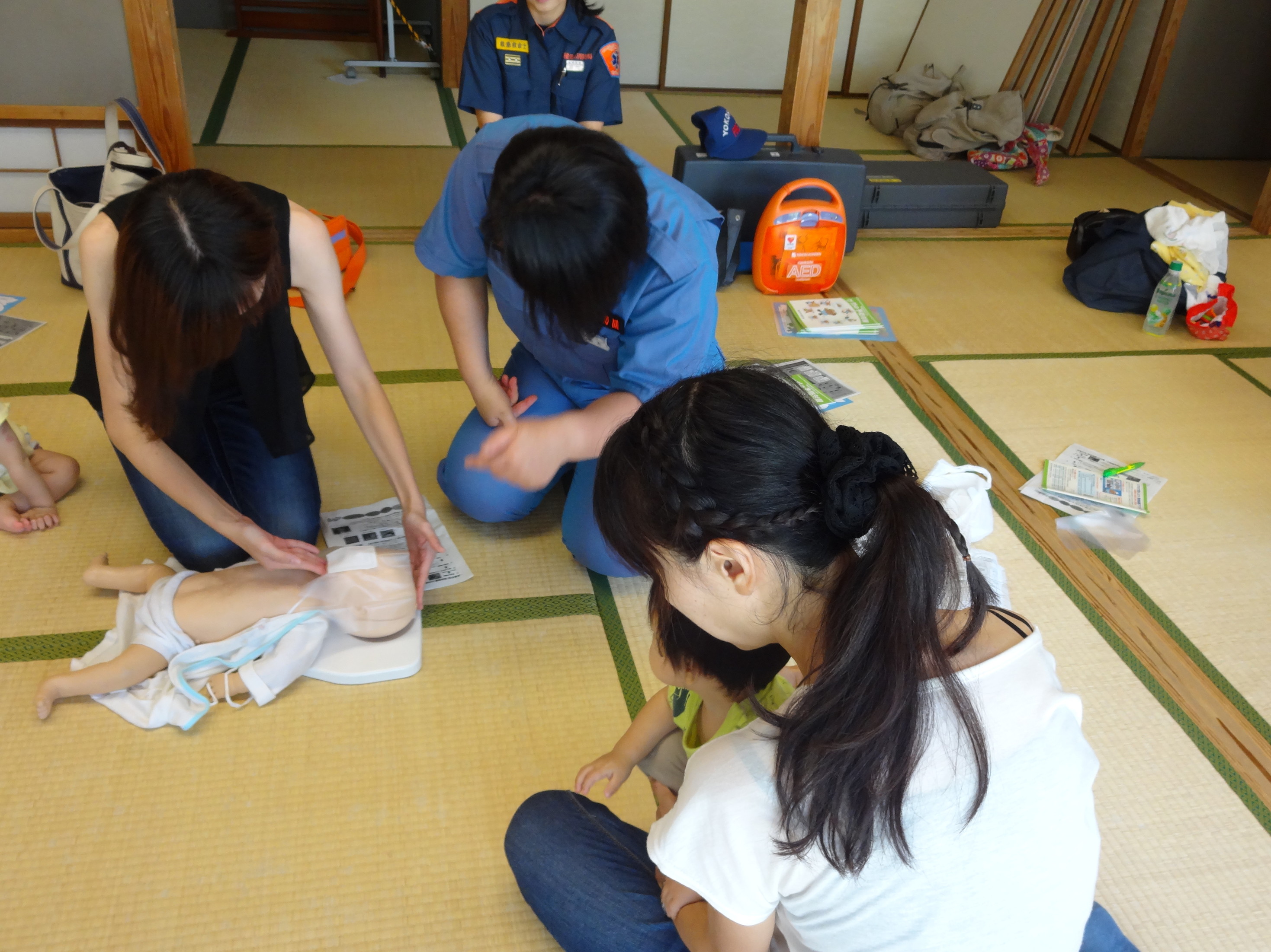 長津田消防出張所所長と女性消防団2名にお越しいただき 小さいお子様の子育て中の親子さんに集まっていただきました。 小さいお子様の救命救急法や日ごろの不安なこと、いざという時の 対処法をお聞きしました。