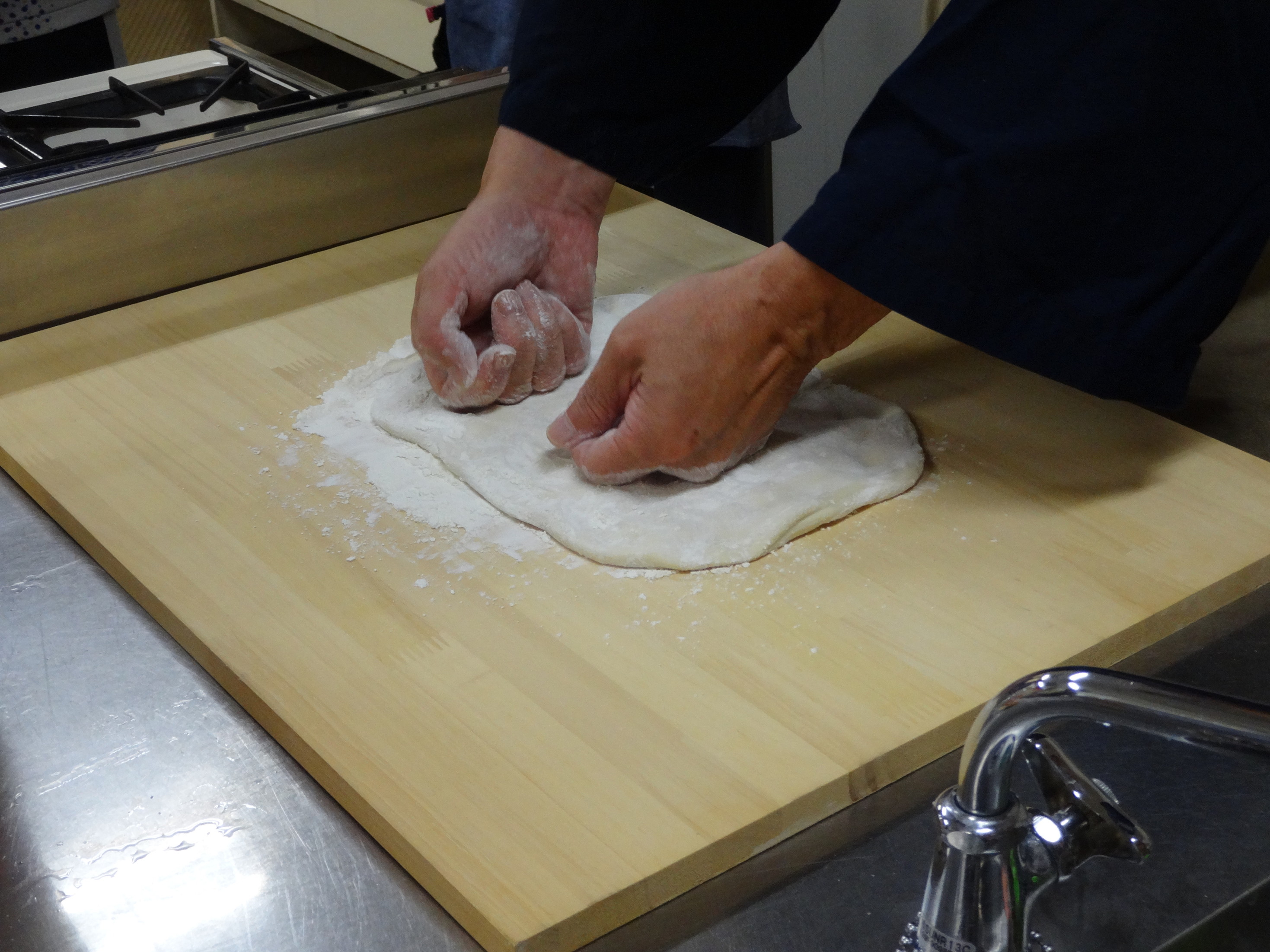 みなさんおなじみのほうとうの麺を作りました。 講師の打った麺で、ほうとうをいただきました。