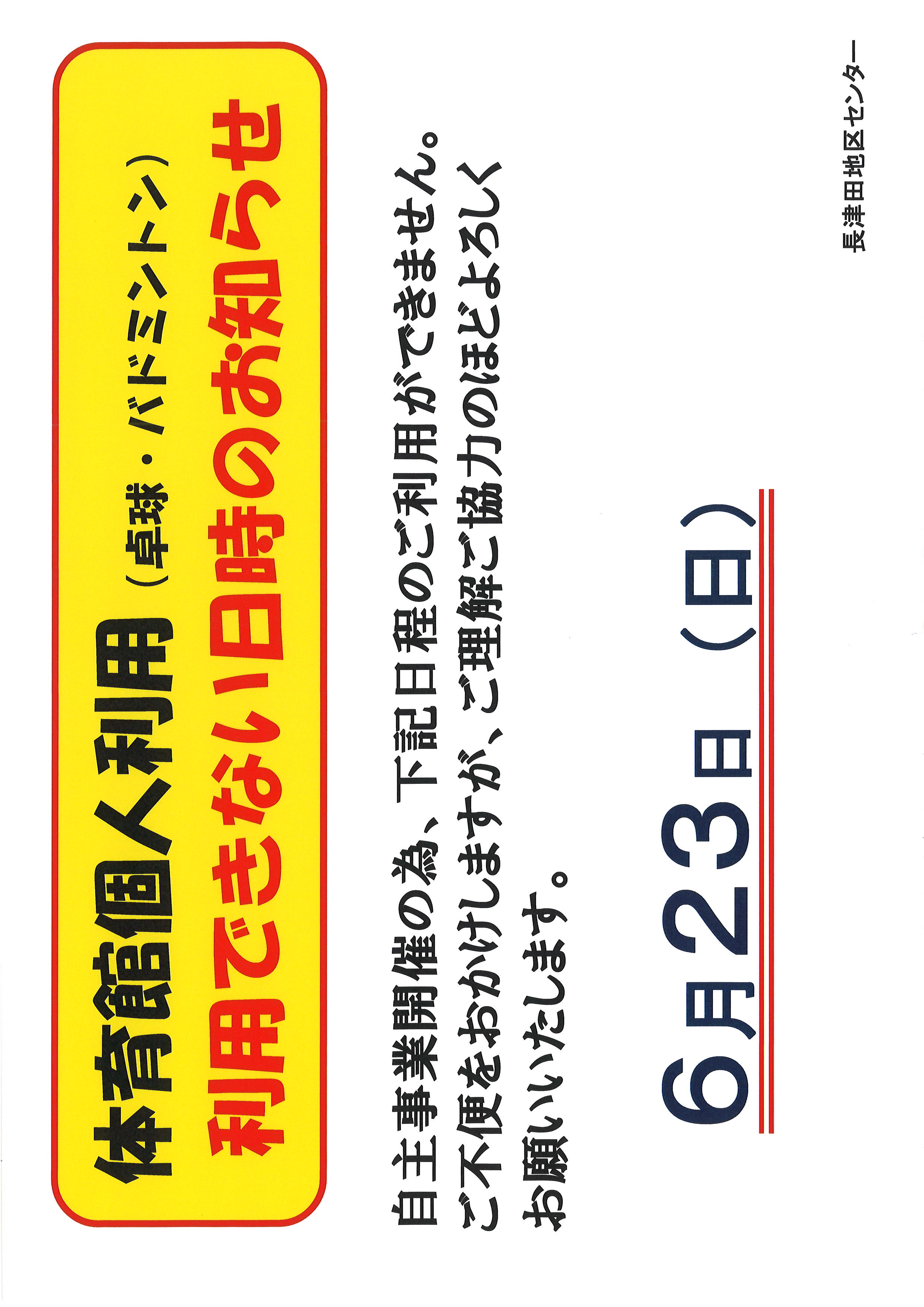 自主事業開催の為、6月23日(日)は体育館個人利用(卓球・バドミントン)のご利用が出来ません。 ご不便をお掛け致しますが、何卒ご理解ご協力の程よろしくお願い致します。