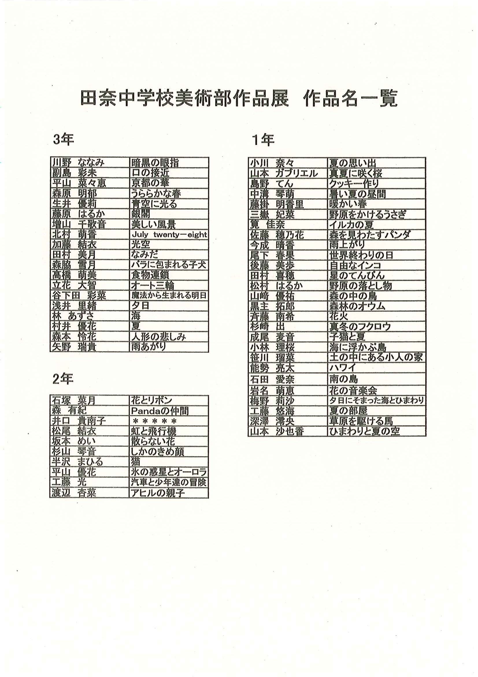 田奈中学校美術部作品展 作品名一覧